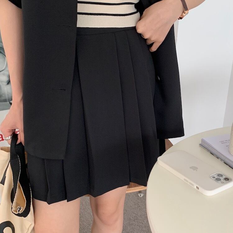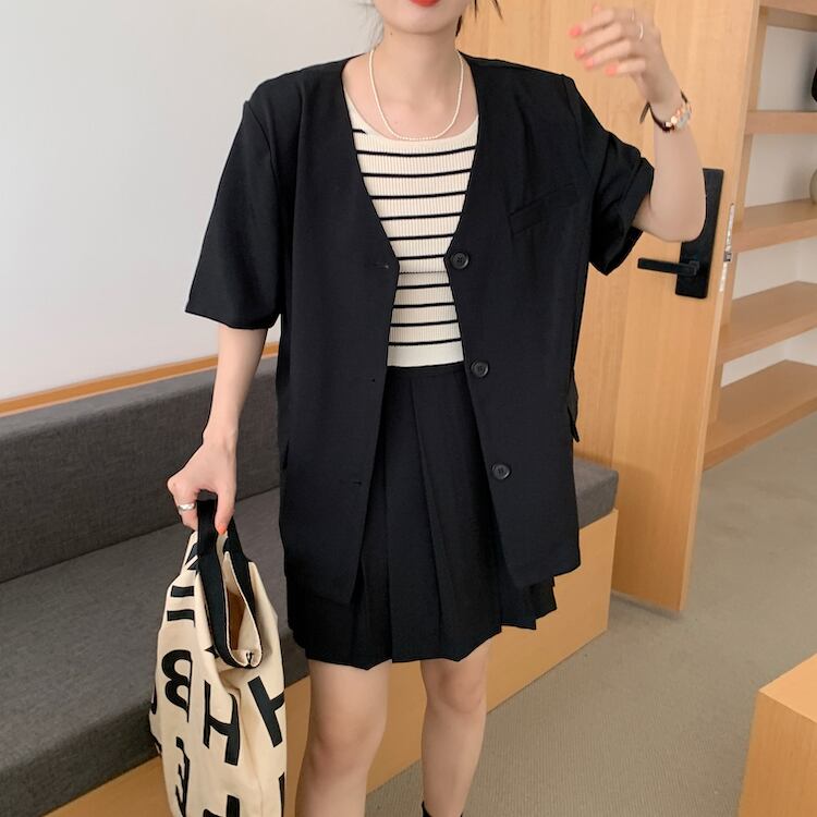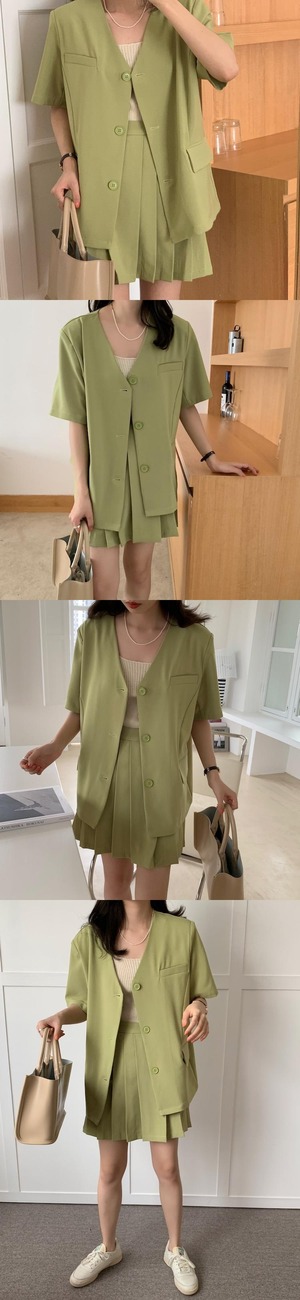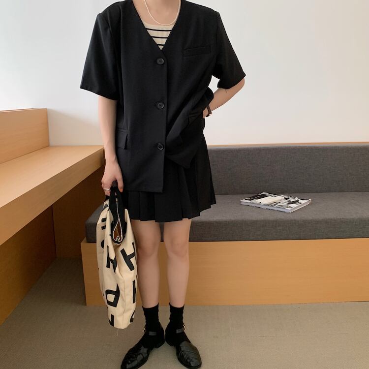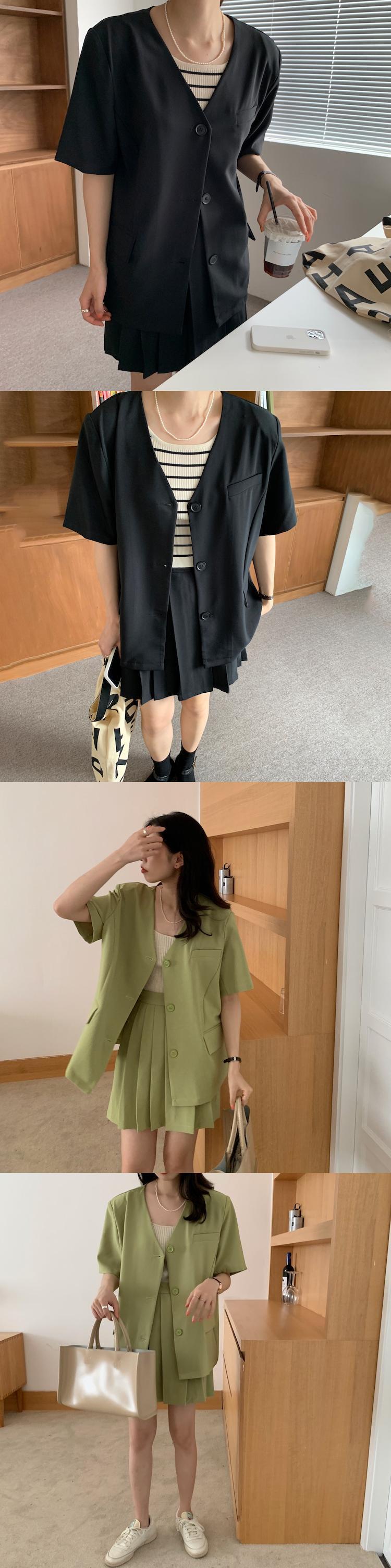 サマーハイウェストウェストスリムAラインプリーツスカート Vネックソリッド カラージャケット 夏物 ソリッドカラー クレセントシティ70939941180