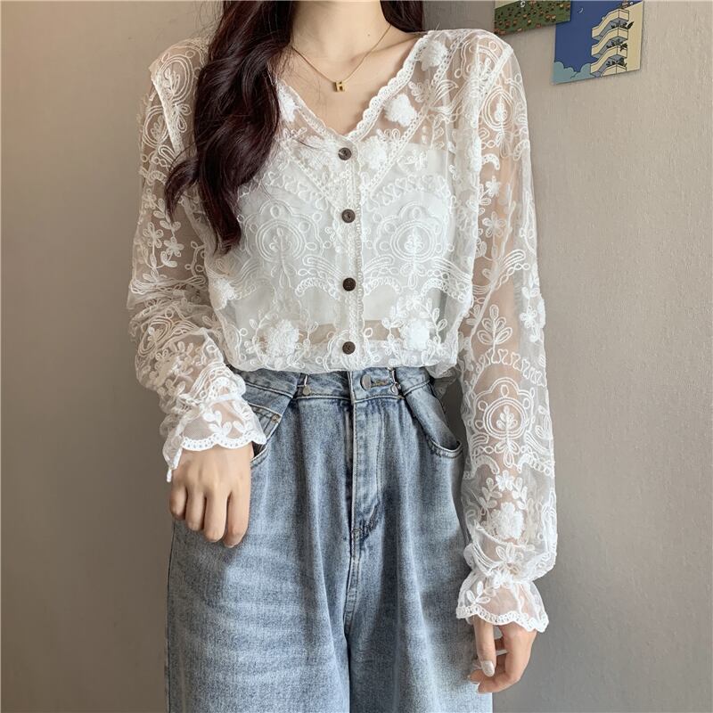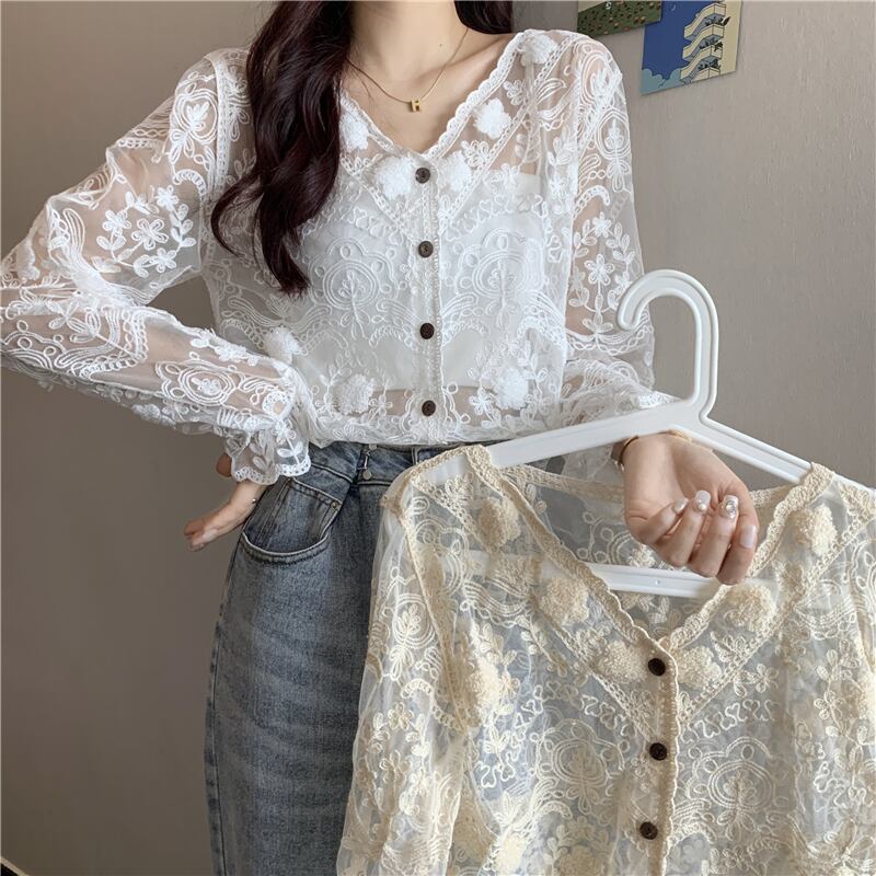 レースシャツ サマーVネックルーズ薄手カーディガントップス ロング 夏物 クレセントシティ17800068590