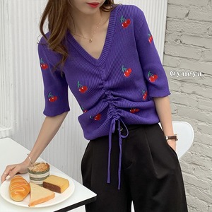 ショートギャザーVネックニットTシャツ レディースサマースリム薄手トップス 夏物 パープル クレセントシティ5637947304