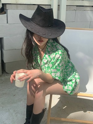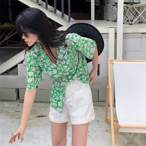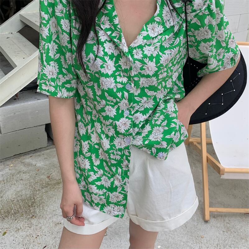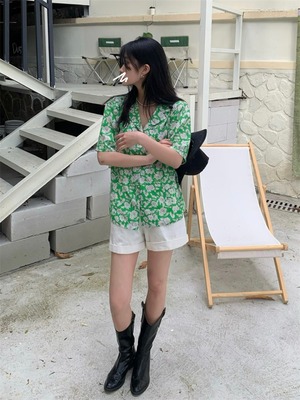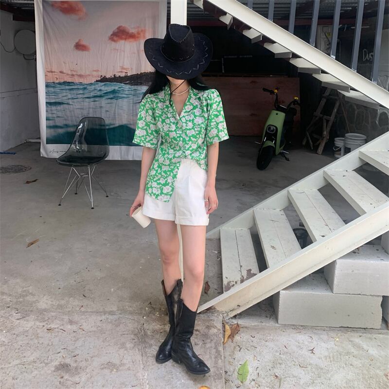 スタンダードグリーンFlowerデザイン フローラルシャツ ハイウェストホワイトショーツ カジュアル レトロ ブルマー 花柄 フラワーデザイン クレセントシティ29306186799