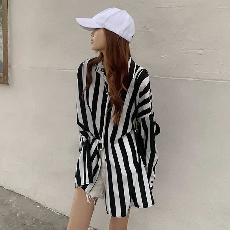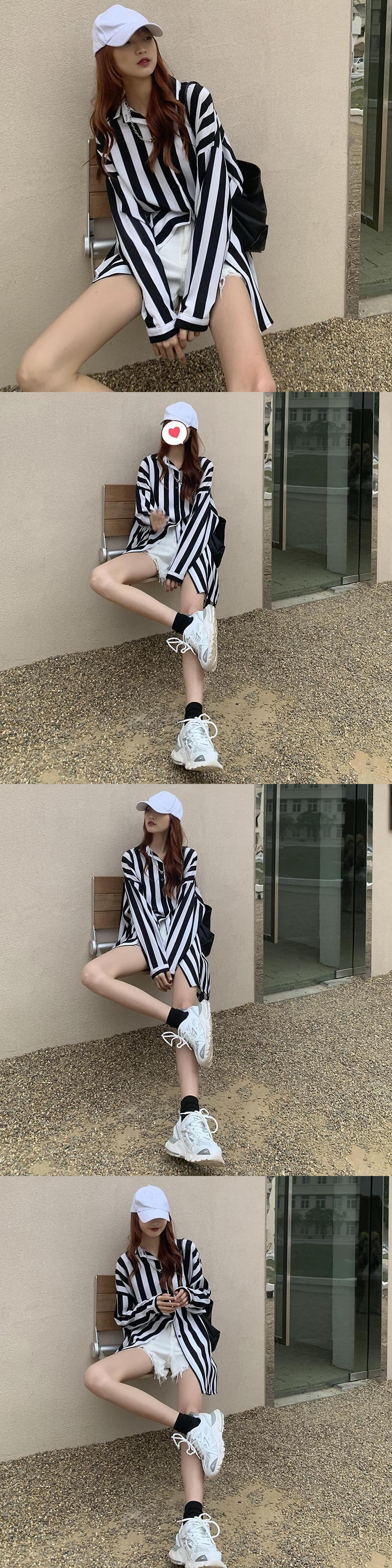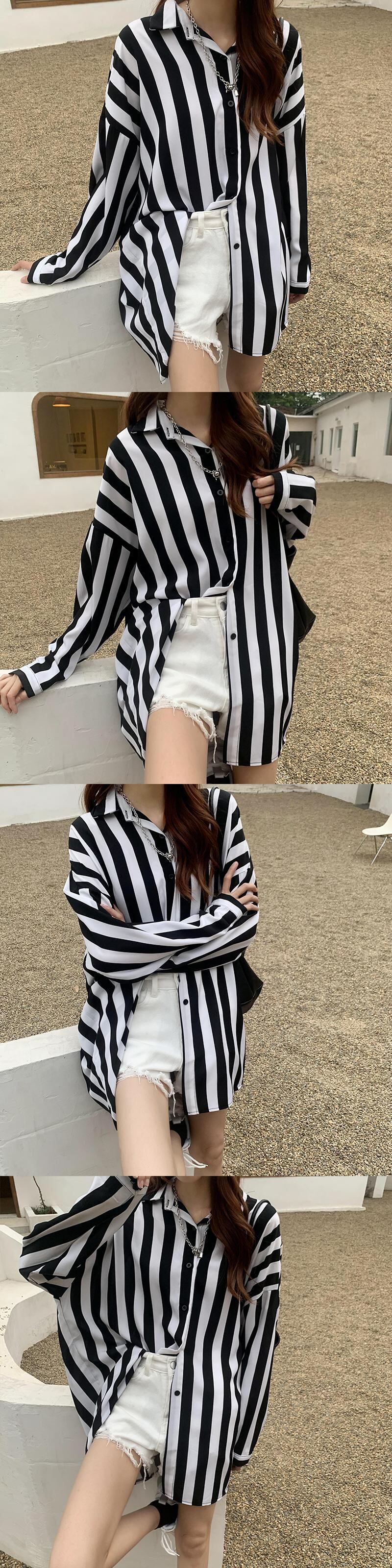 ブラックホワイトストライプシャツ レディースサマールーズ薄手長袖スリーブジャケット ロング 夏物 クレセントシティ4533349288