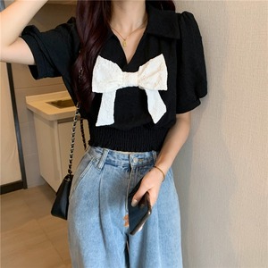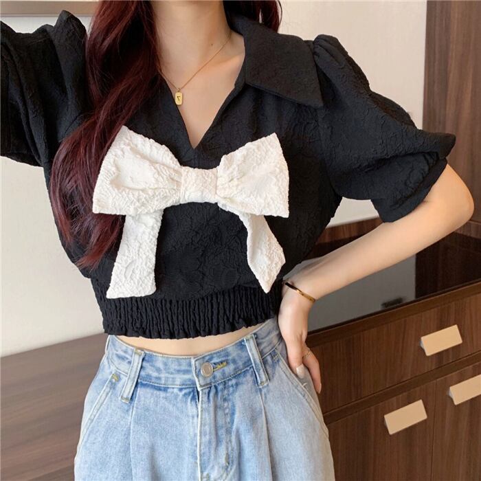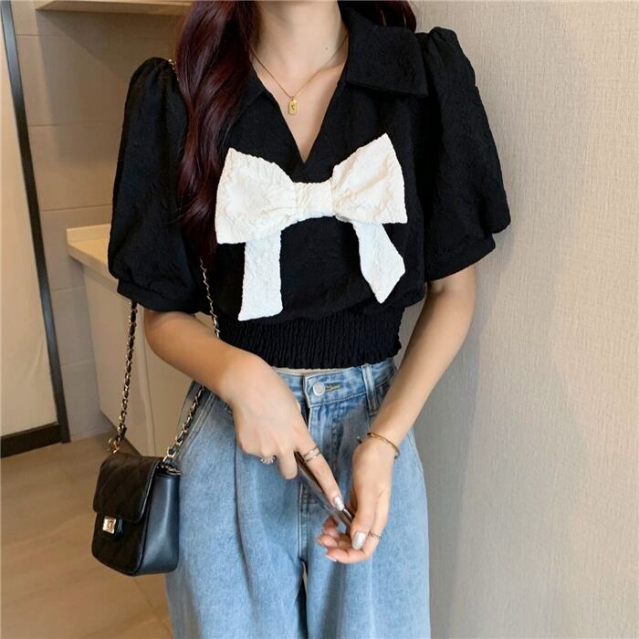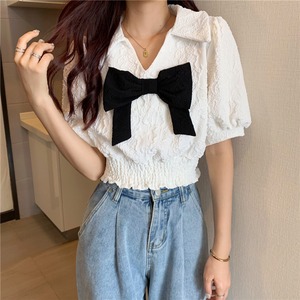リボンVネックショートシャツ レディースサマースタイルスリムトップス 夏物 クレセントシティ21382124838