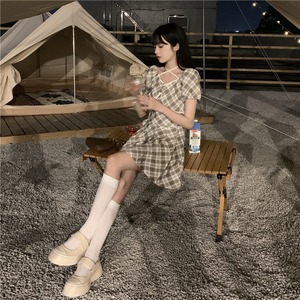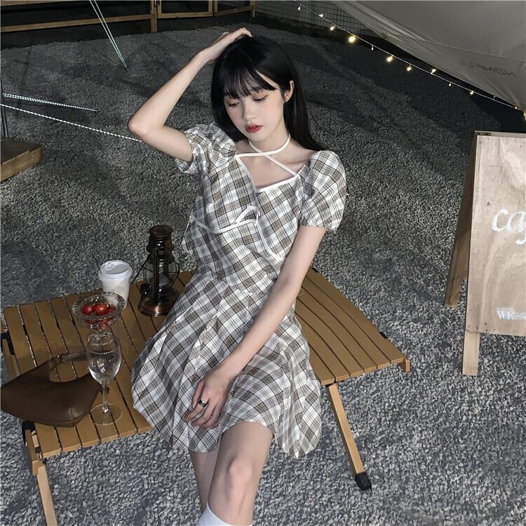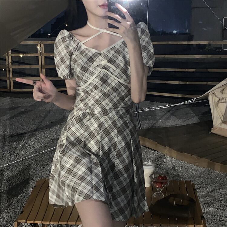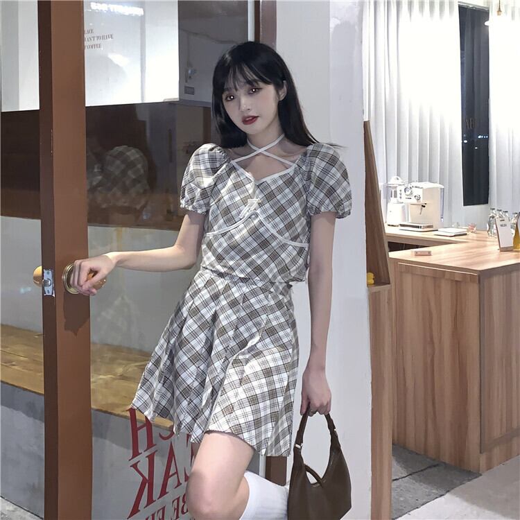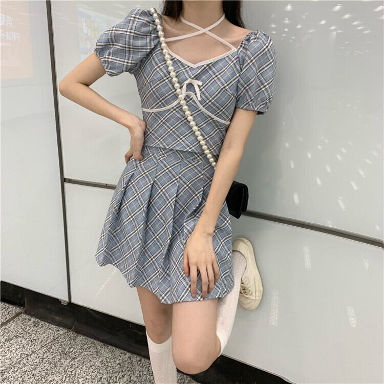 スタンダード格子柄ホルターTシャツ トップス ハイウェストウェストプリーツAラインスカート レトロ クレセントシティ10218913570