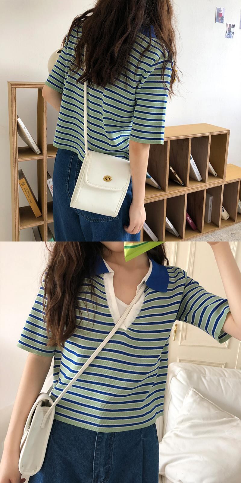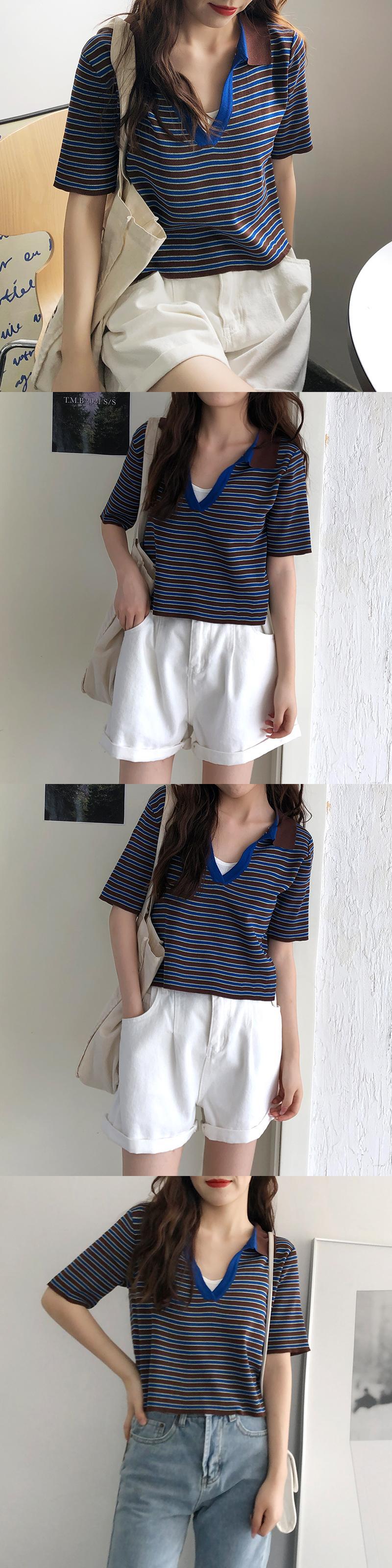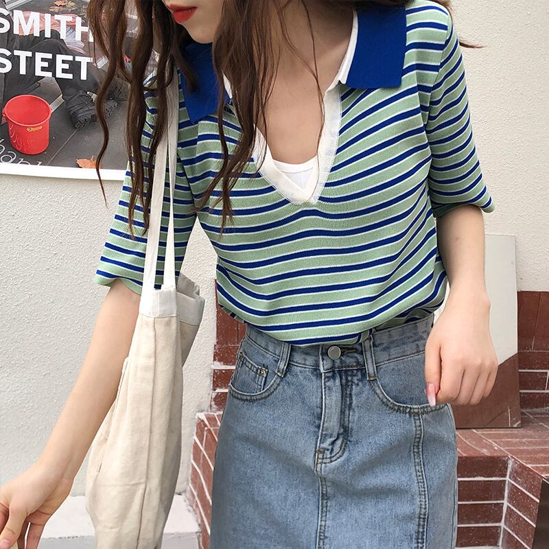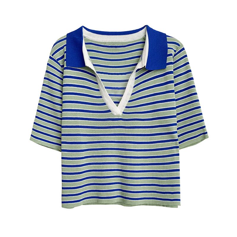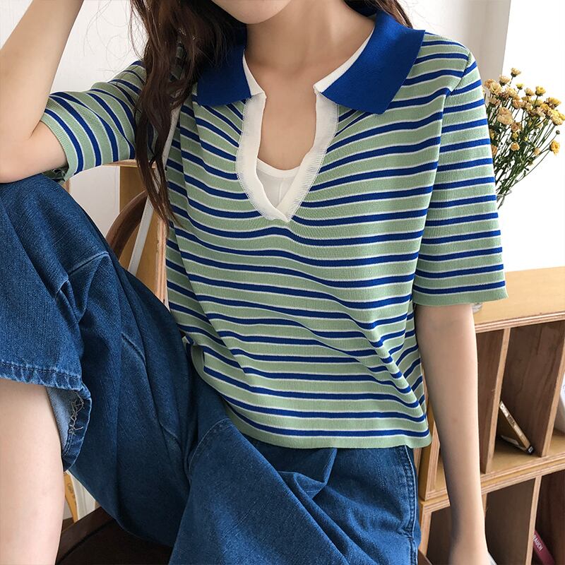 ストライプセーター サマー薄手ルーズ半袖スリーブトップス ショート ハーフスリーブ 夏物 クレセントシティ64560567815