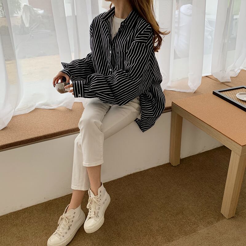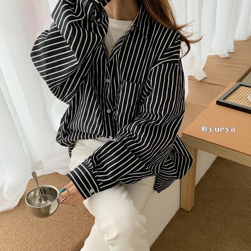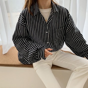 ストライプシャツ スプリングルーズ薄手長袖スリーブジャケット ロング 春物 クレセントシティ63334900533