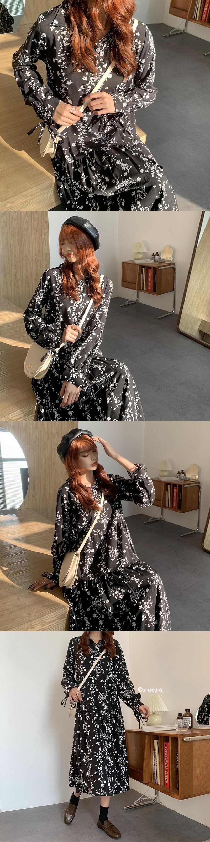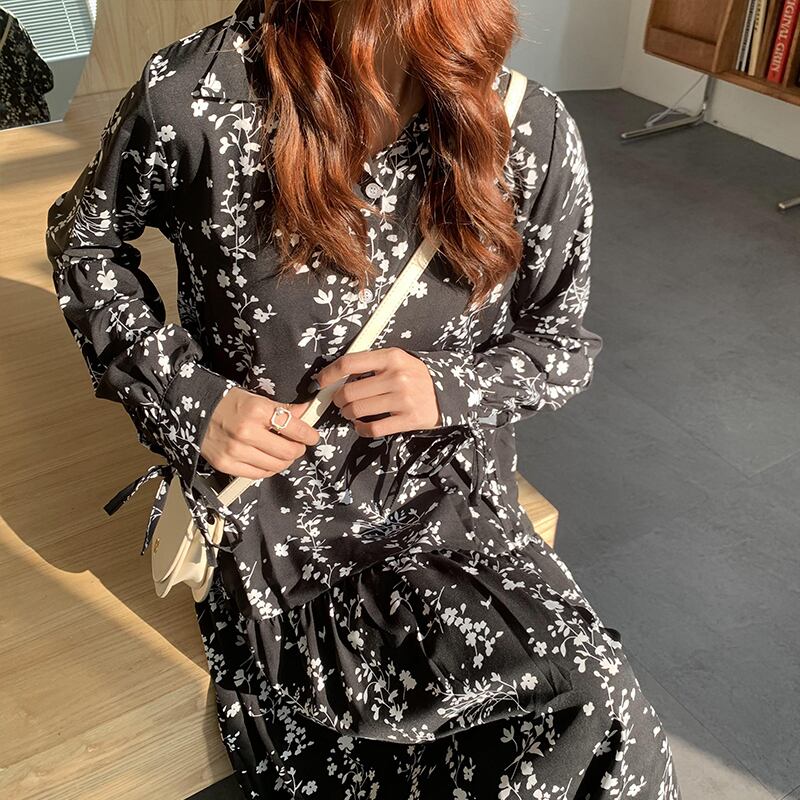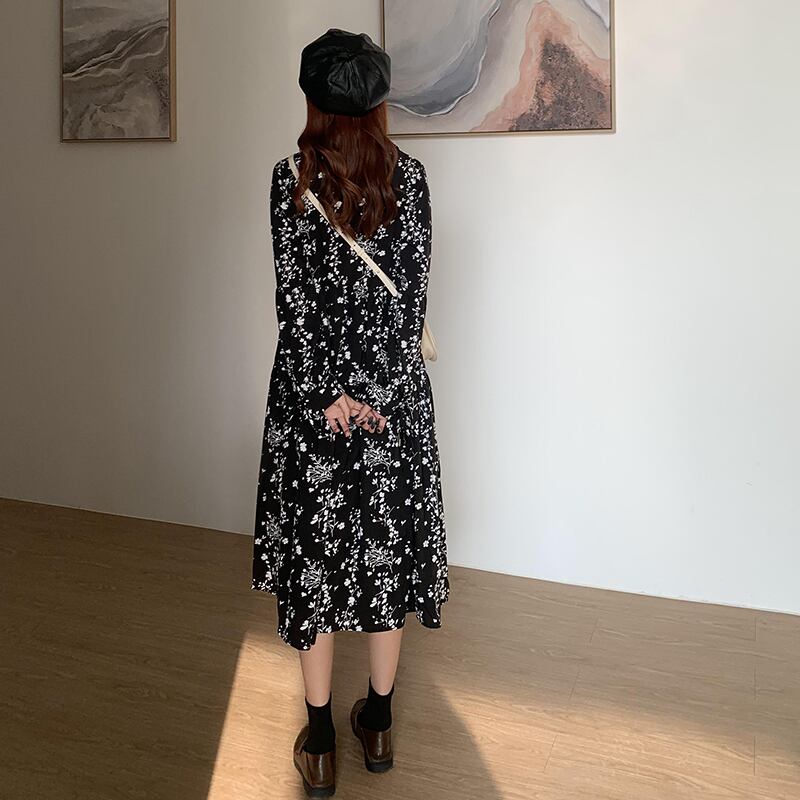 スタンダードフローラルドレス スタイルルーズウェストAラインブラック レトロ オータム 秋物 ウィンター 冬物 花柄 クレセントシティ36663335524