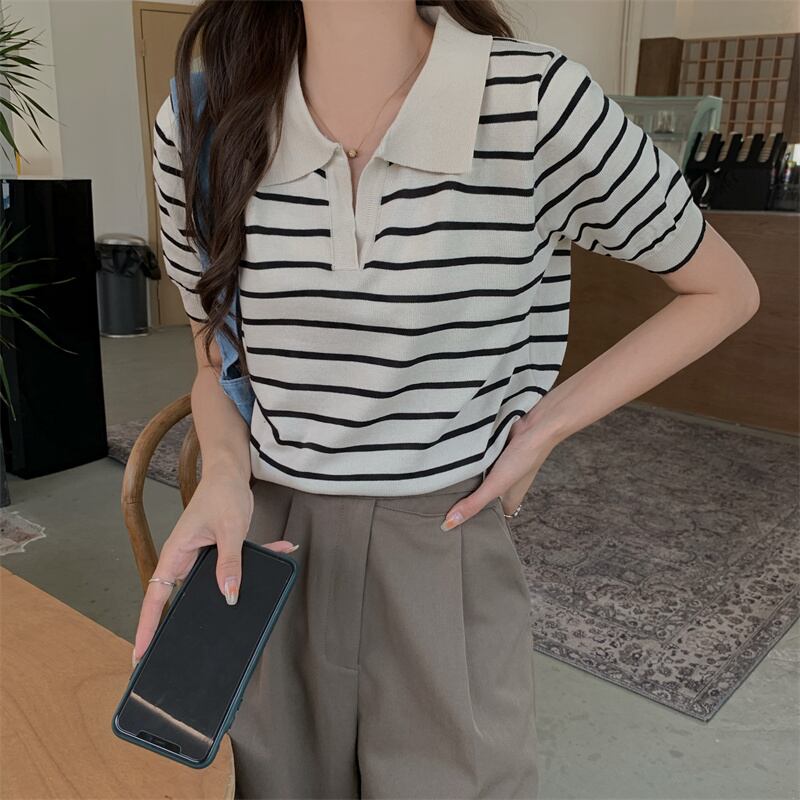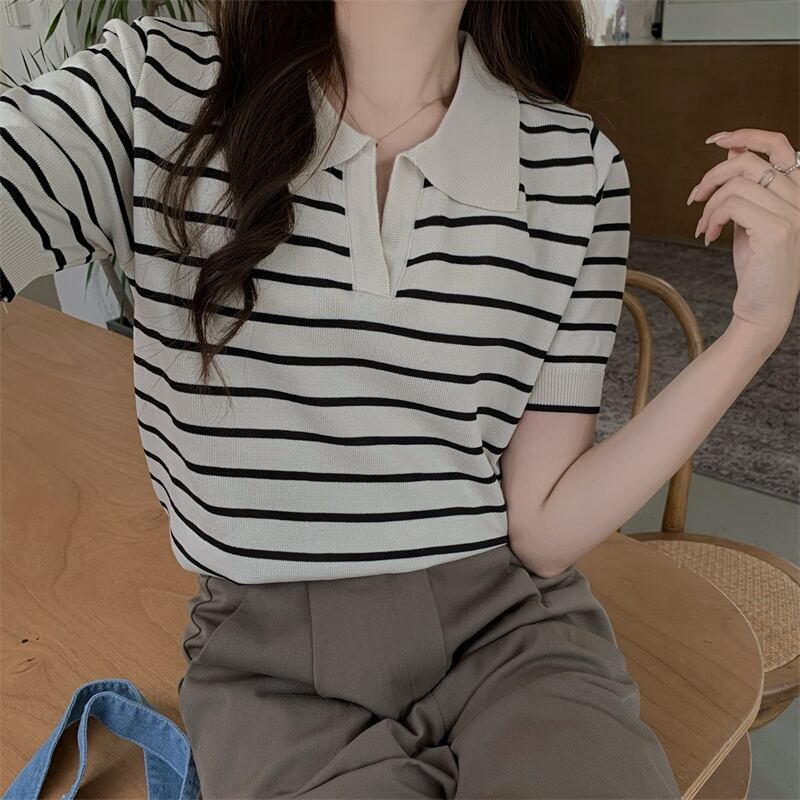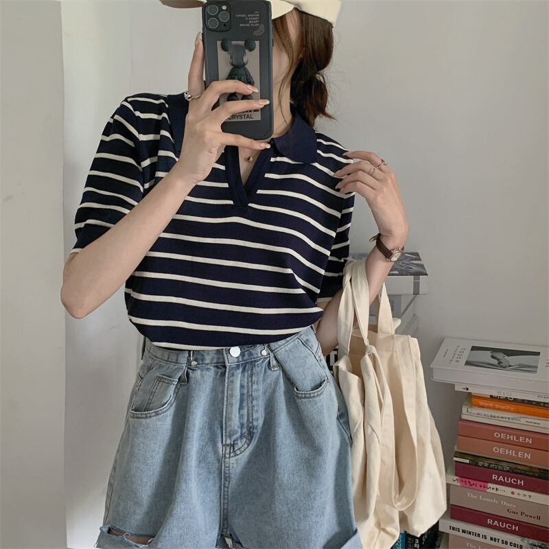 ストライプシャツ レディースサマーカジュアルルーズ薄手ニットセーター トップス 夏物 シルク クレセントシティ25447581602