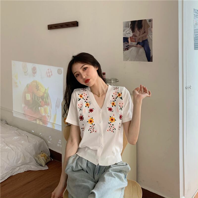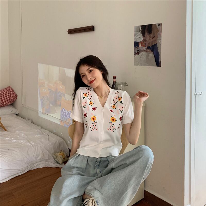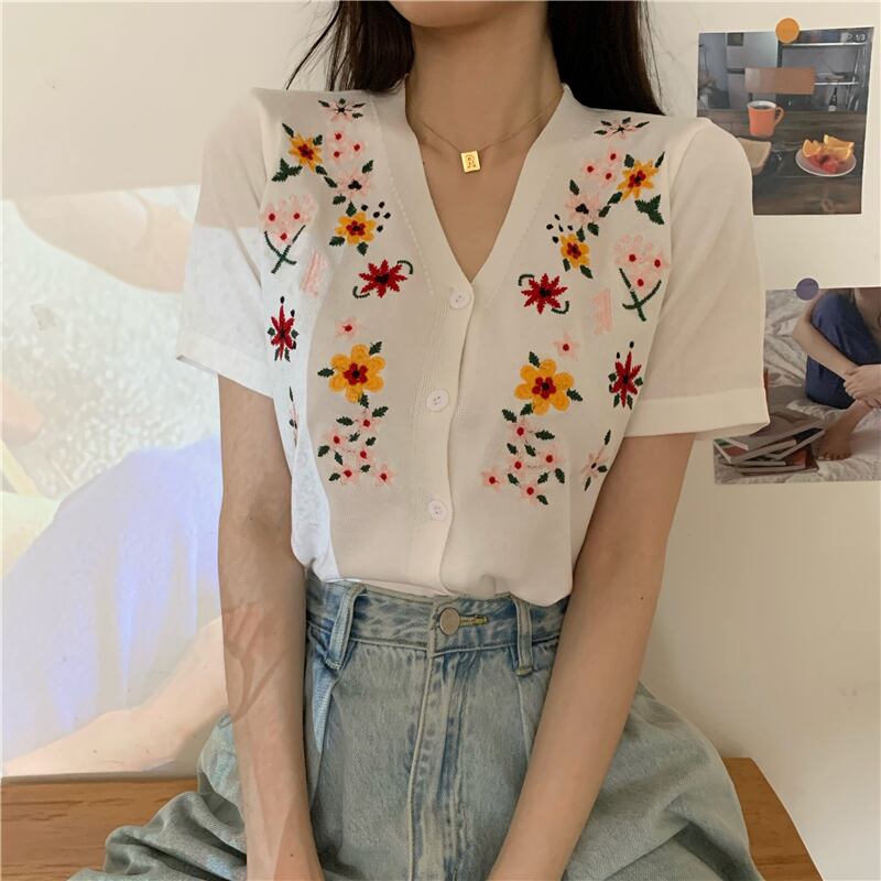 Flowerデザイン 刺繍ニットセーター サマースタンダードVネック半袖スリーブカーディガンシャツ ショート レトロ ハーフスリーブ 夏物 フラワーデザイン クレセントシティ56702149786