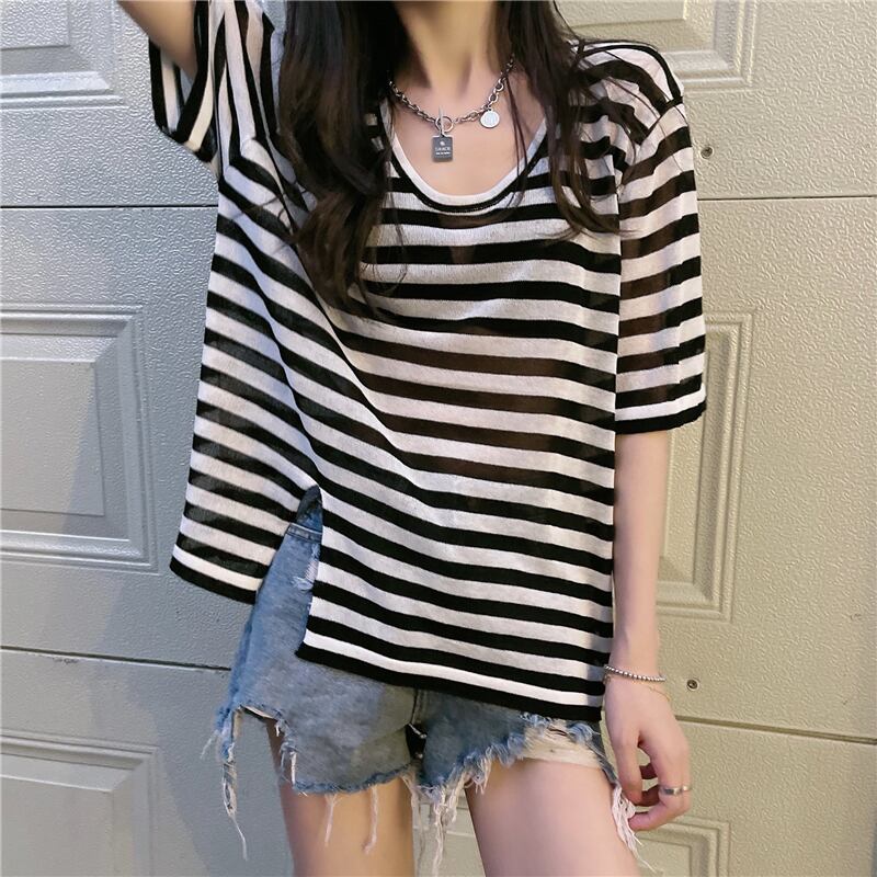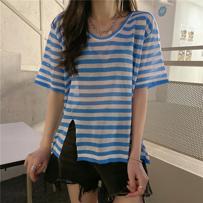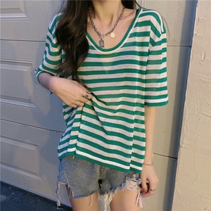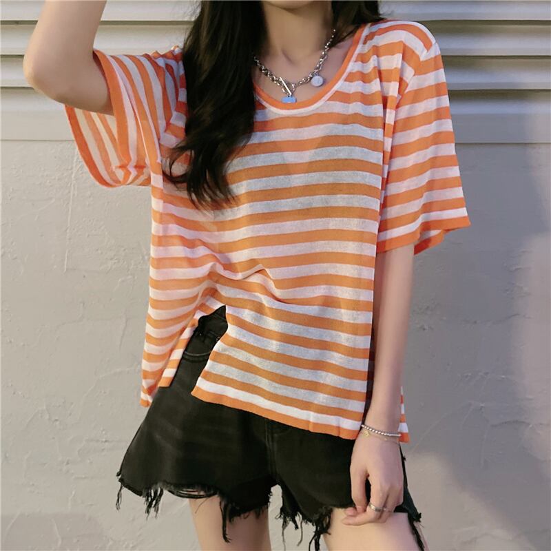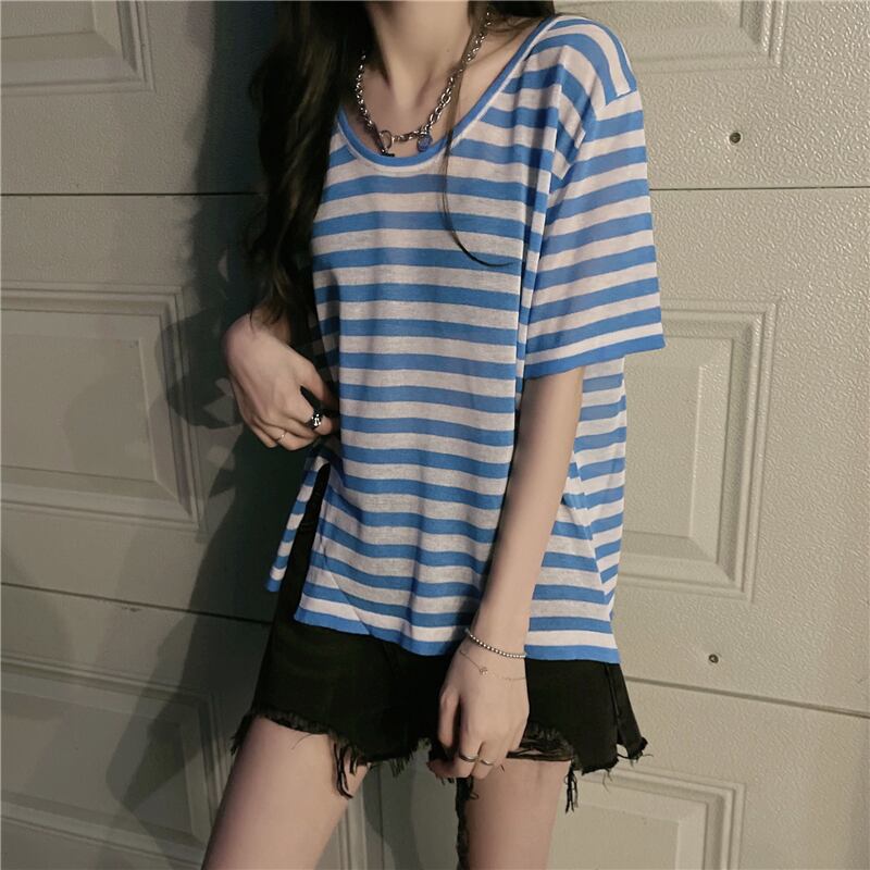ストライプTシャツ サマーカラーカジュアルルーズトップス 夏物 クレセントシティ3096786034