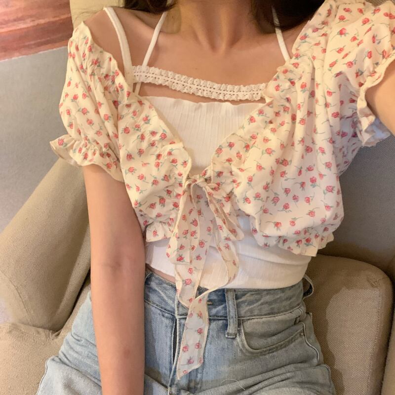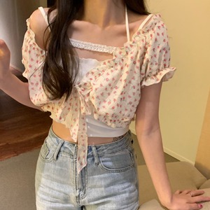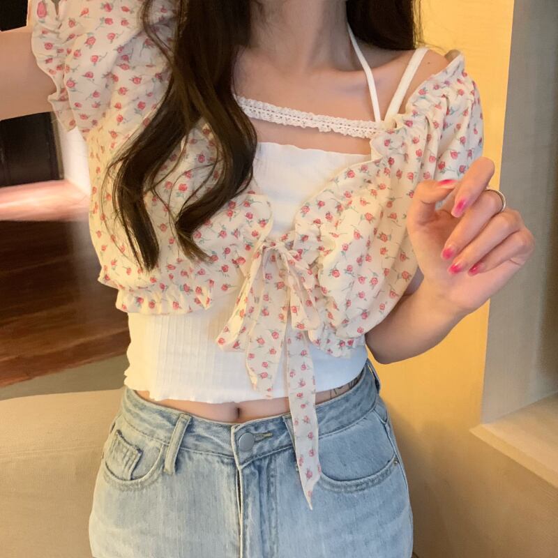 サマーフローラルレーストップス 大人ガーリー スウィート キュート カジュアル 夏物 花柄 レースアップ クレセントシティ25108064429