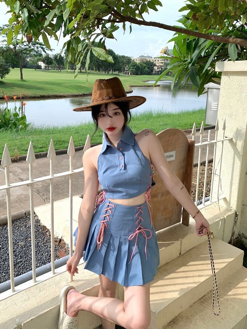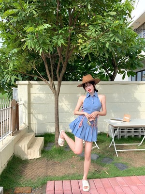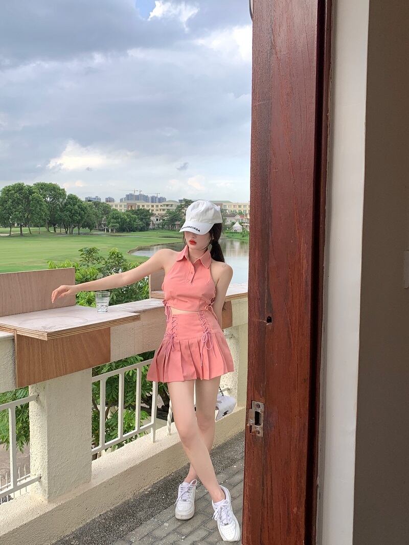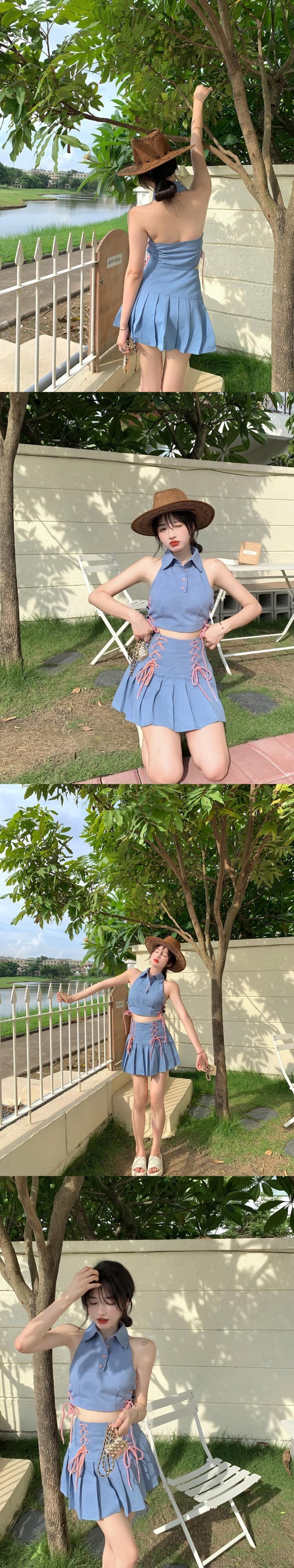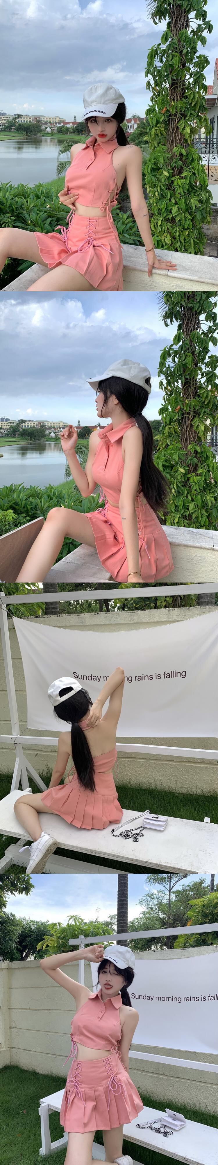 スカート サマーハイウェストウェストプリーツショートノースリーブホルタートップス 半袖 ハーフスリーブ 夏物 クレセントシティ20348054031