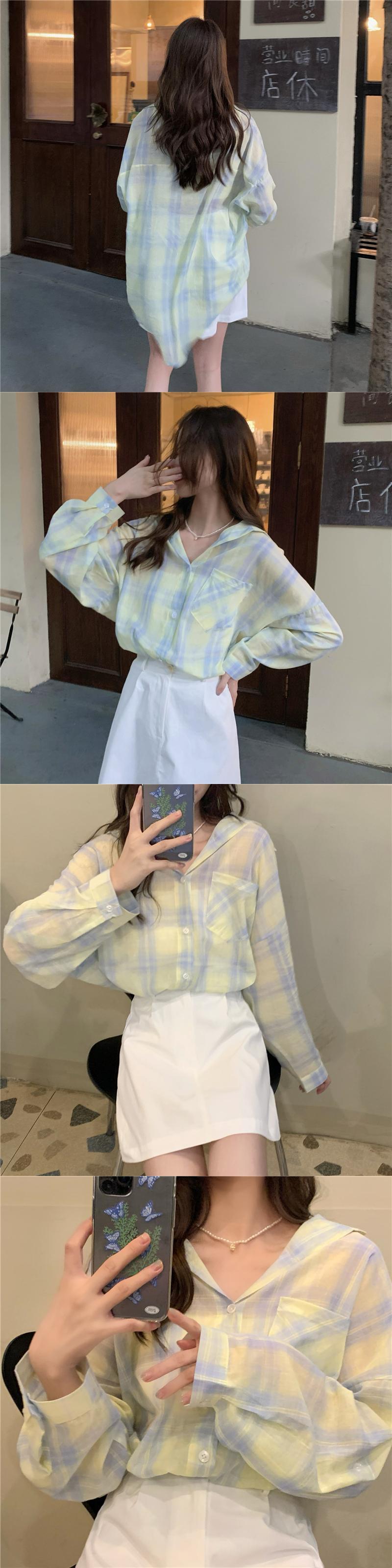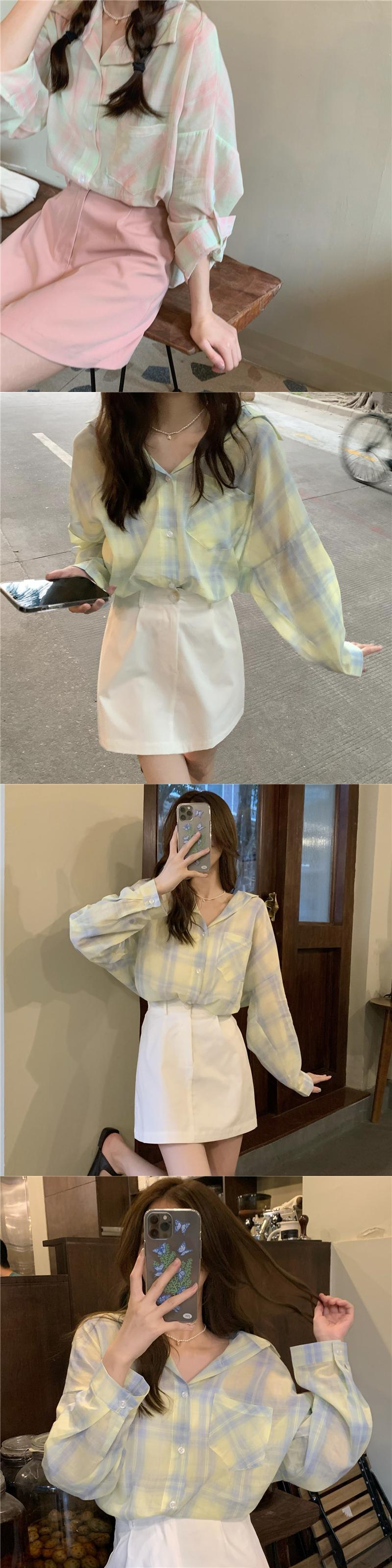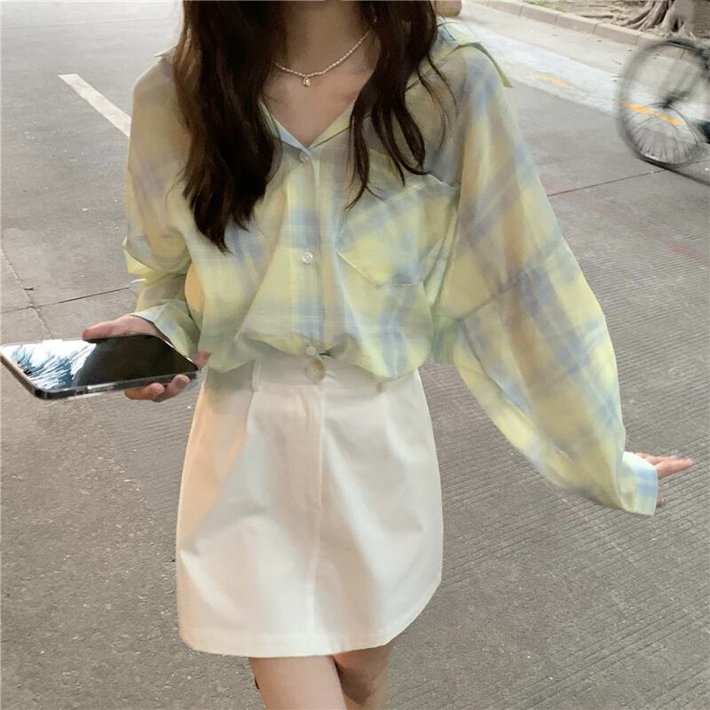 スカート サマーホワイトハイウェストウェストルーズカジュアル薄手格子柄シャツ ロング 夏物 クレセントシティ96725414321