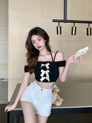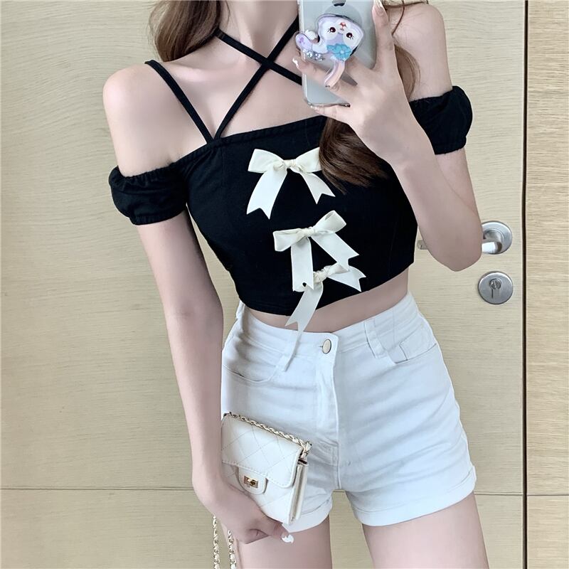 トップス サマーブラックリボンスリムショートTシャツ 夏物 クレセントシティ63272777953