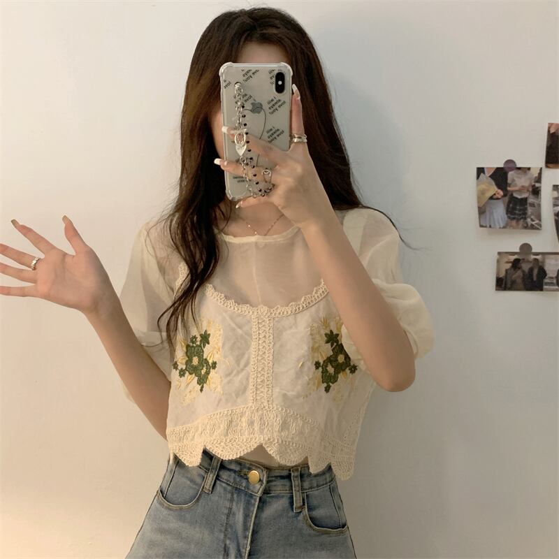 スタンダードサマーノースリーブスタイルブラウス レッド レトロ 刺繍 夏物 クレセントシティ97029094928