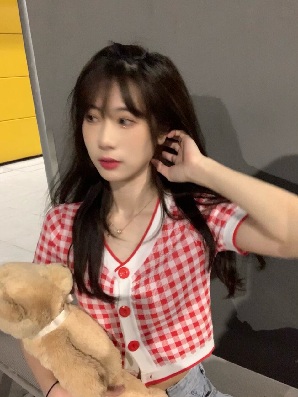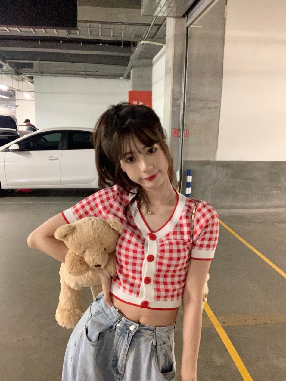 格子柄トップス サマーVネックショートクロップドハイウェストウェストセーター 大人ガーリー スウィート キュート カジュアル 夏物 クレセントシティ24180985311