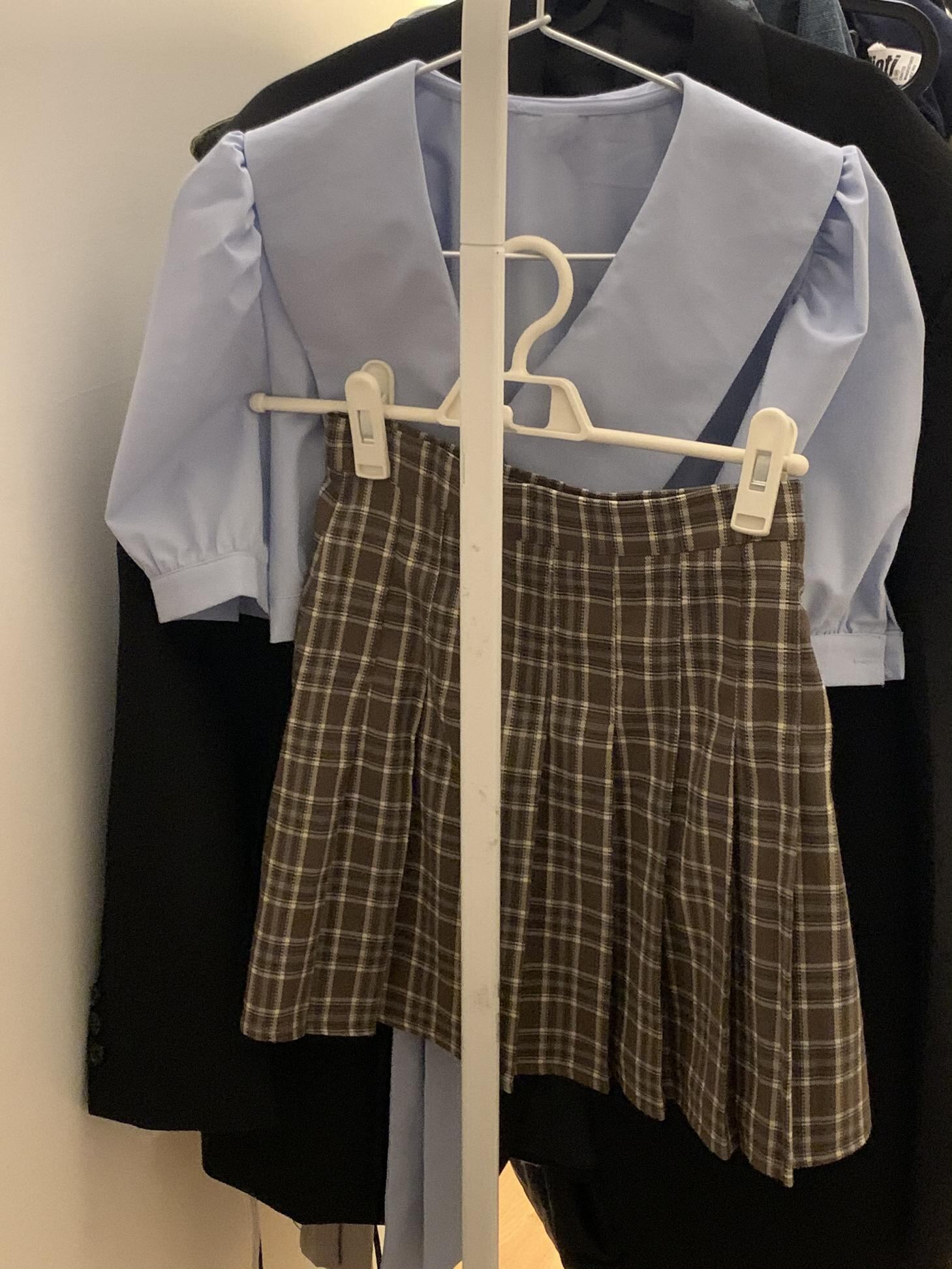色:ベビーブルーのシャツ,チェック柄プリーツスカート