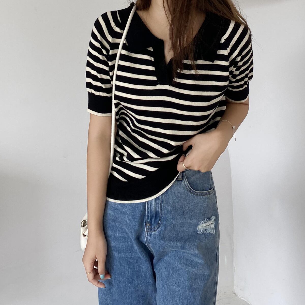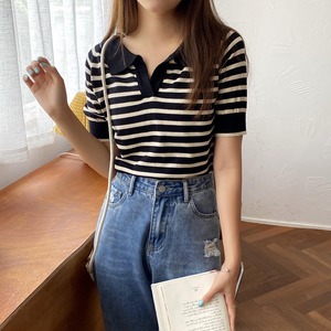 ストライプ半袖スリーブシャツ サマールーズ薄手ニットセーター トップス ショート ハーフスリーブ 夏物 クレセントシティ18174503832