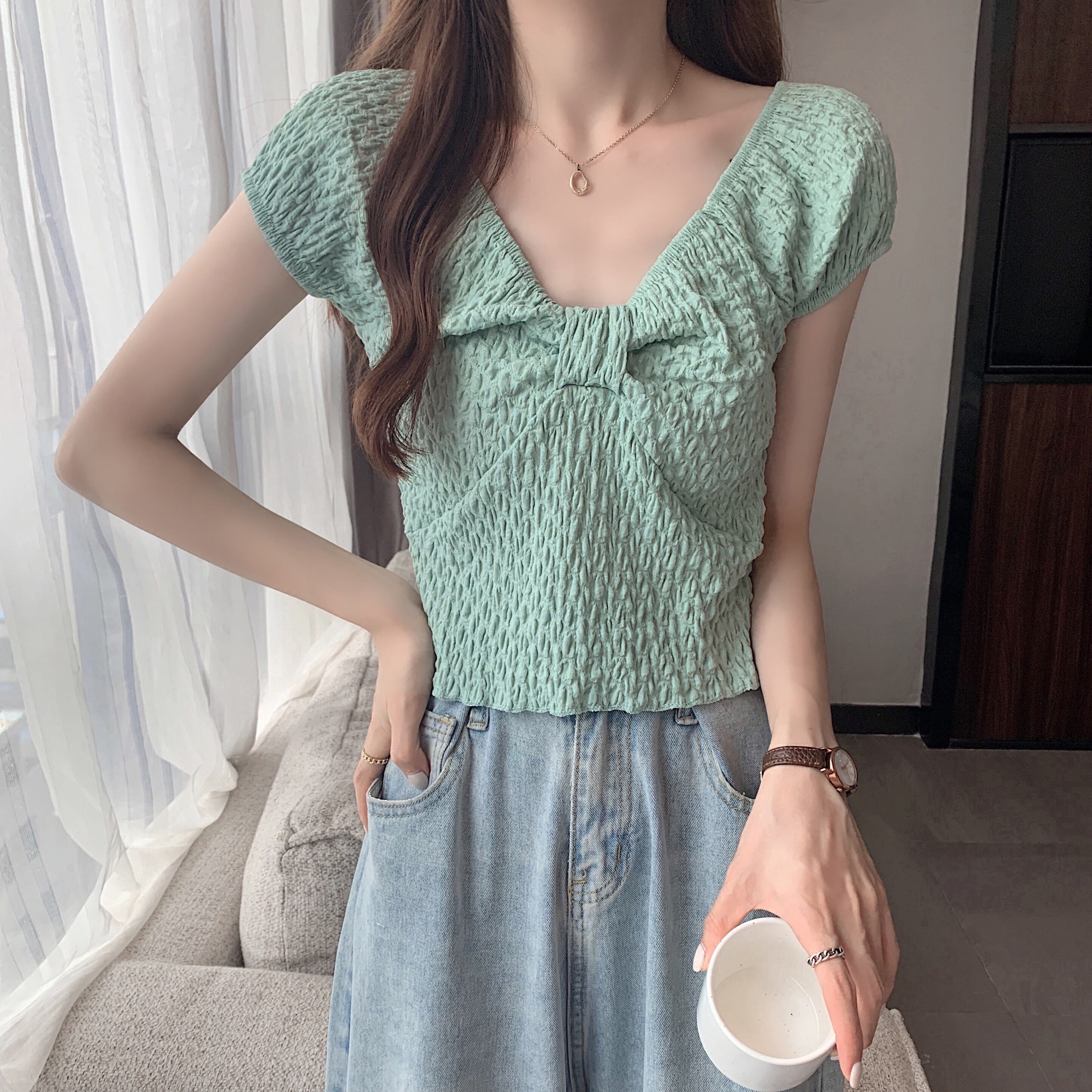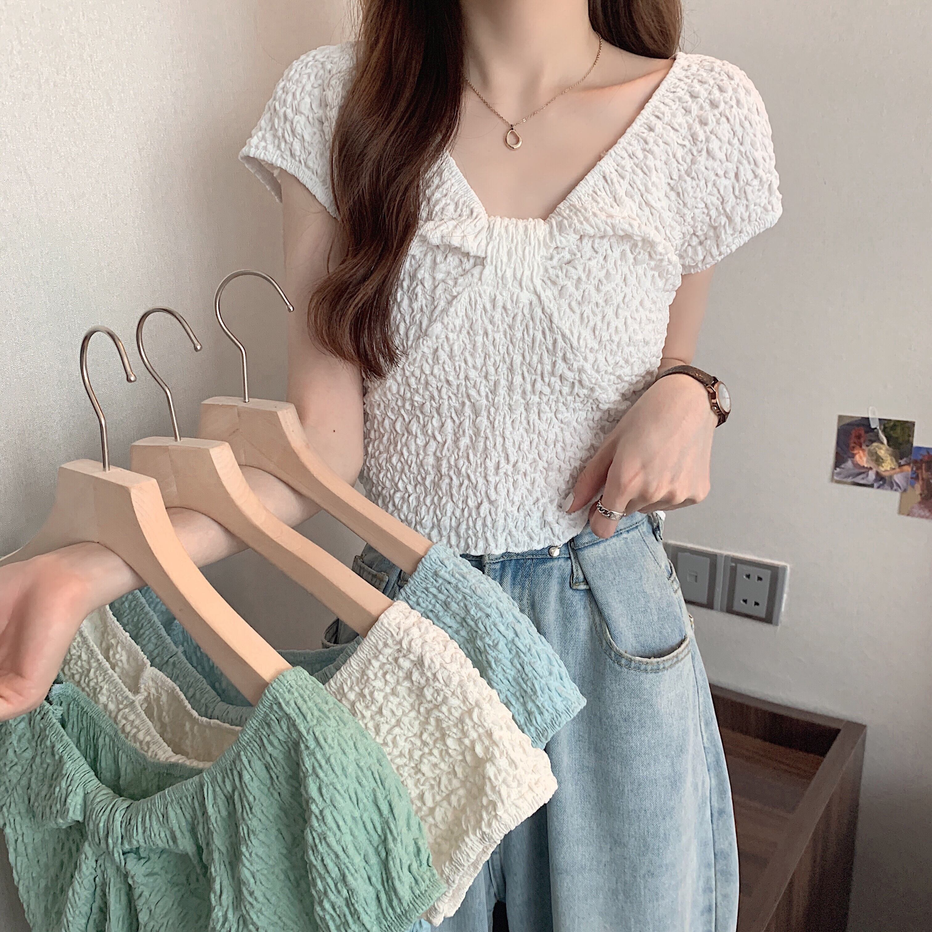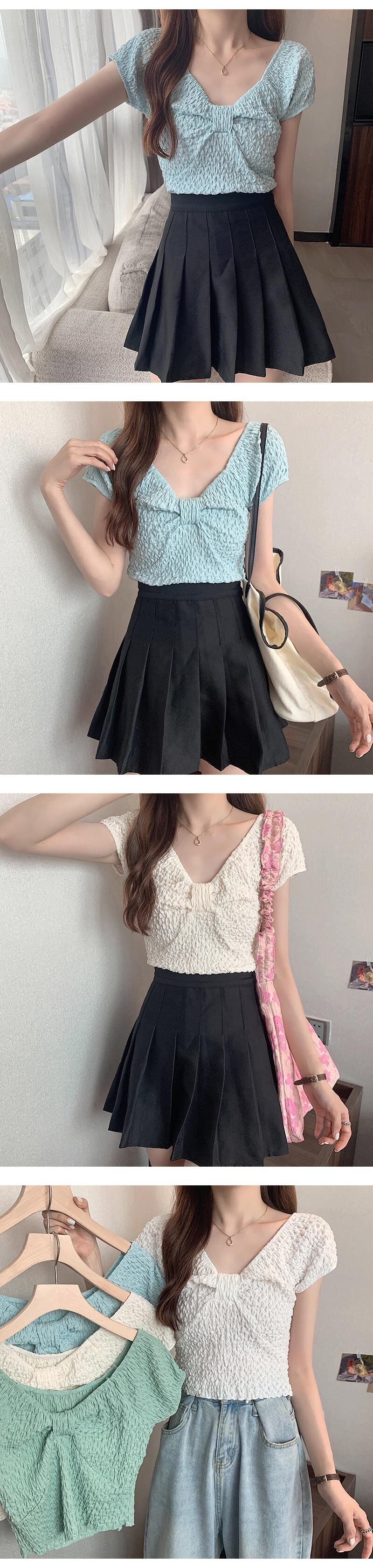 ショートTシャツ サマーリボンプリーツVネックスリムクロップドハイウェストトップス 夏物 クレセントシティ24399800890