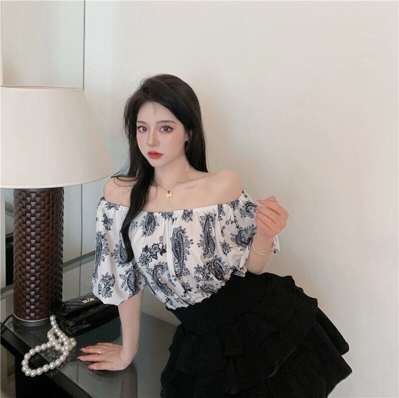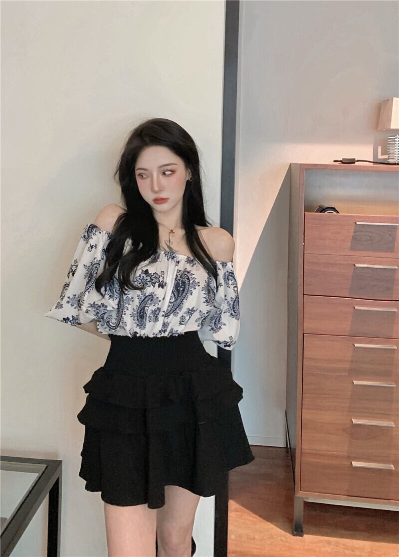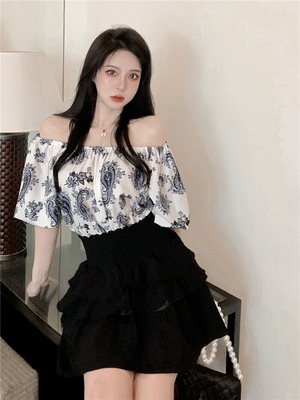 スカート サマーフローラルブラウス ブラックハイウェスト薄手Aライン 夏物 花柄 クレセントシティ67501528440