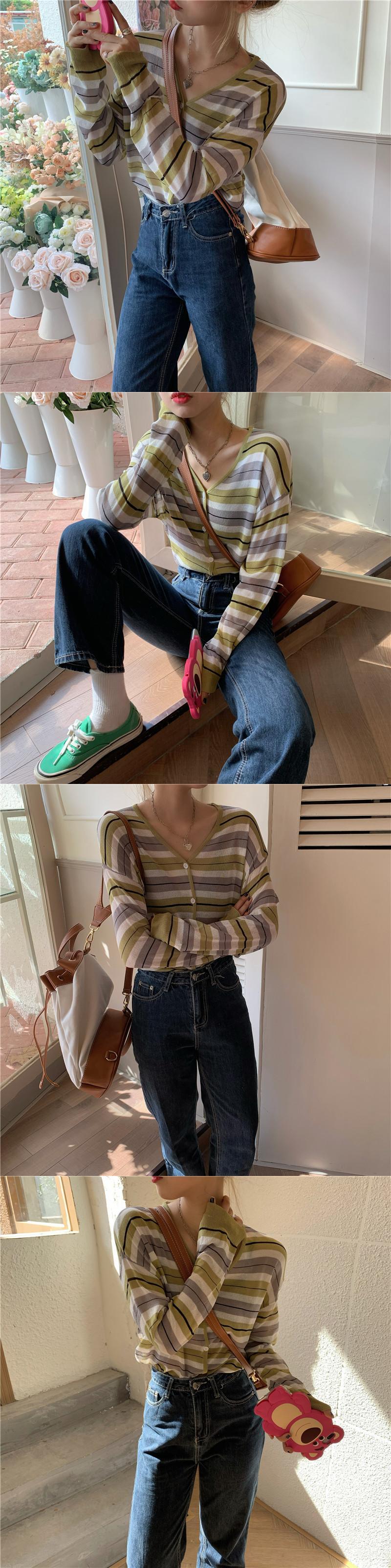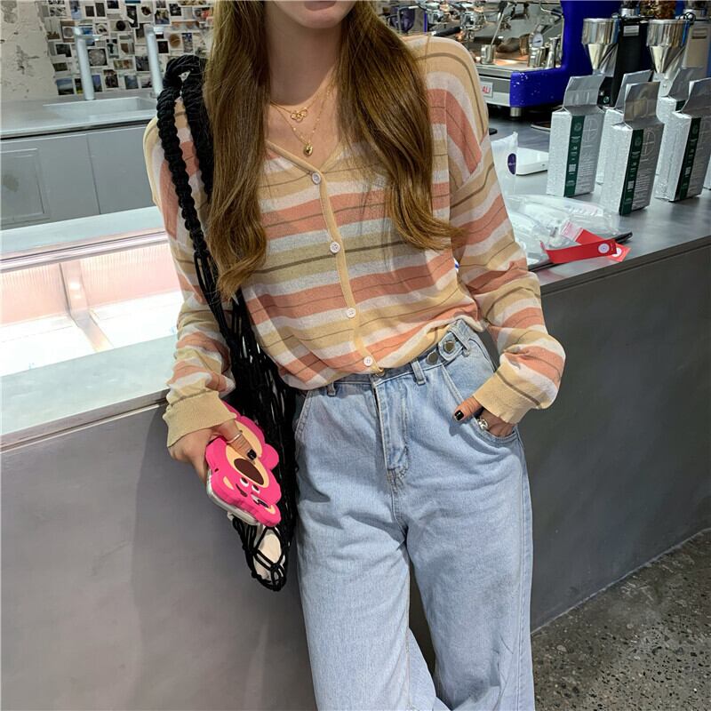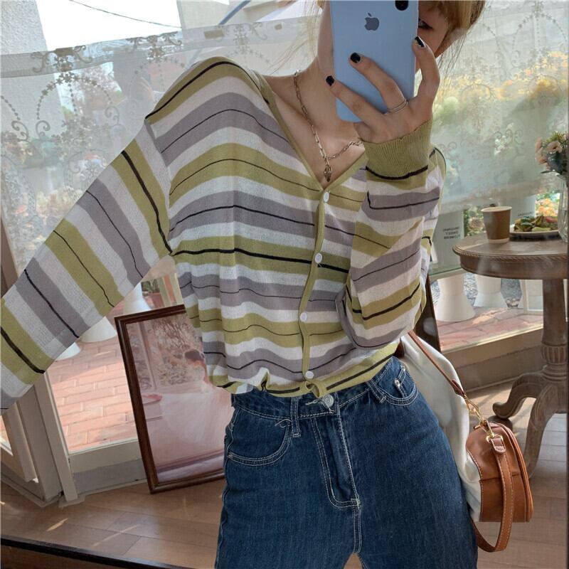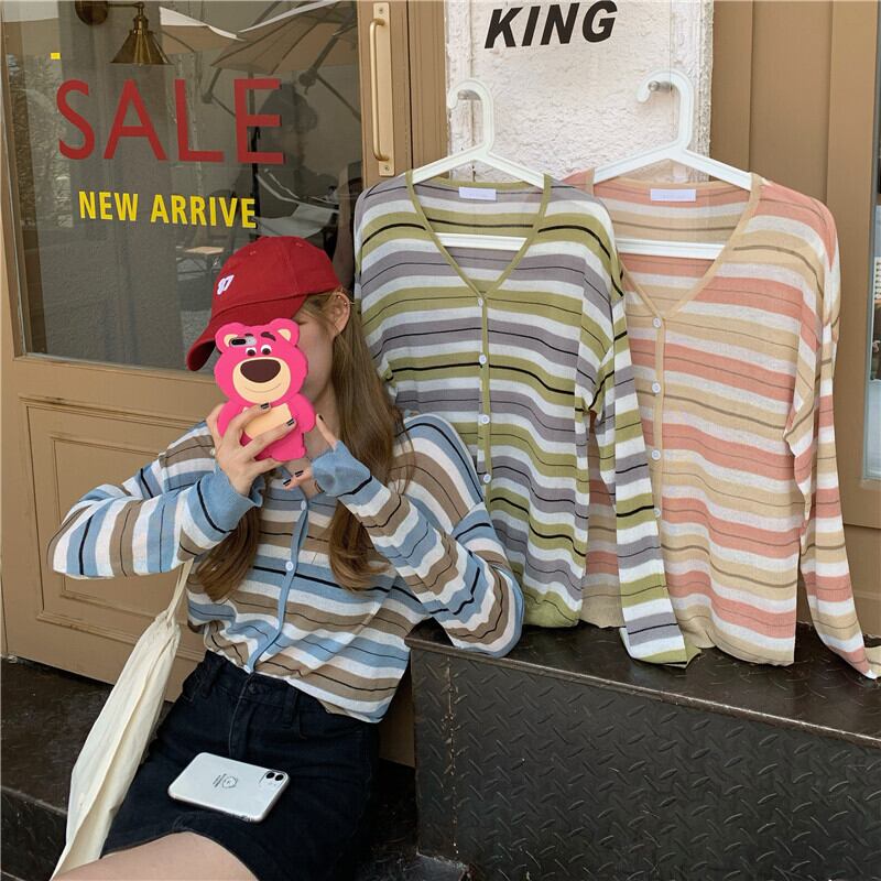 ニットシャツ レディースサマー薄手ルーズVネックカーディガンカジュアルストライプトップス 夏物 クレセントシティ72026497321