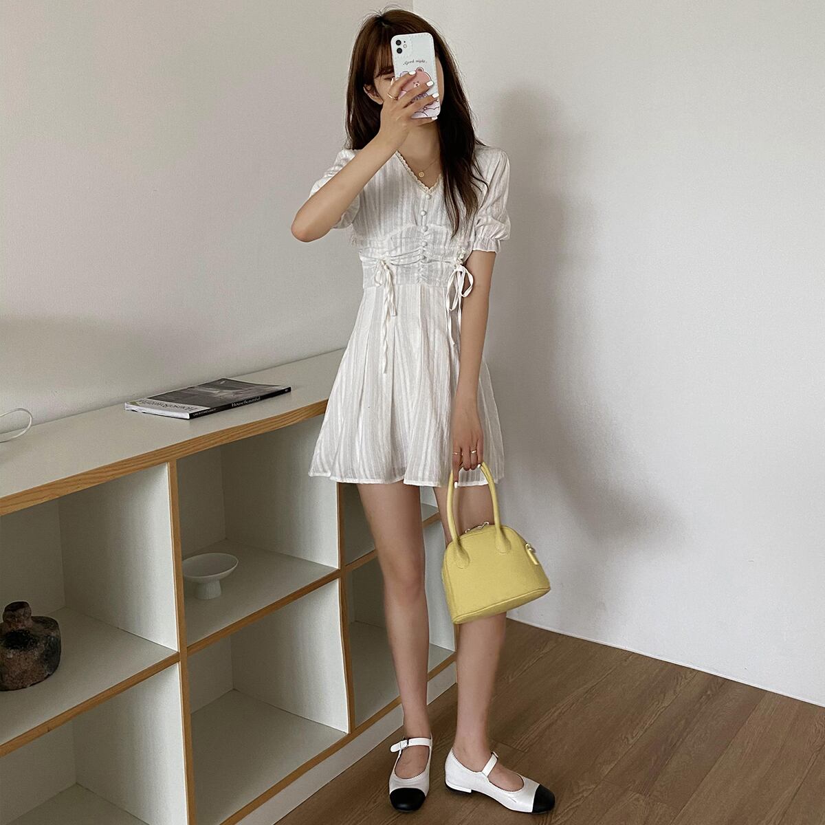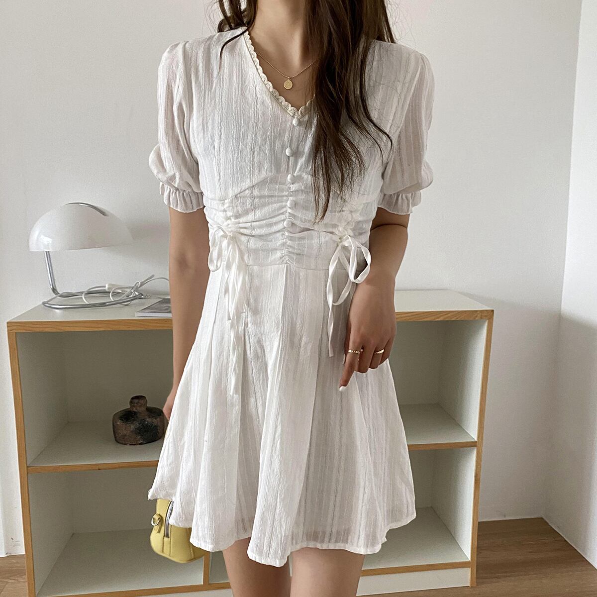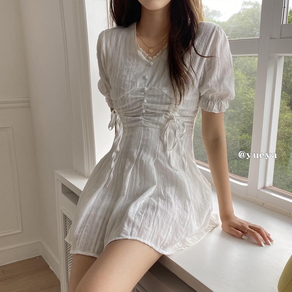 ホワイト半袖スリーブドレス サマースタイルウェスト薄手 ショート ハーフスリーブ 夏物 クレセントシティ50924558293