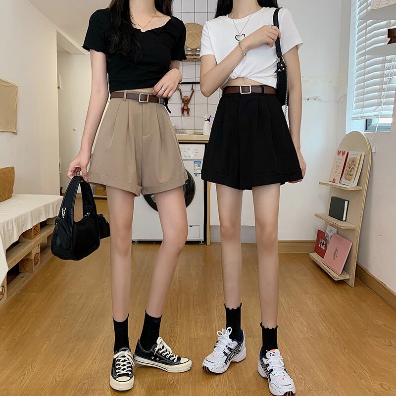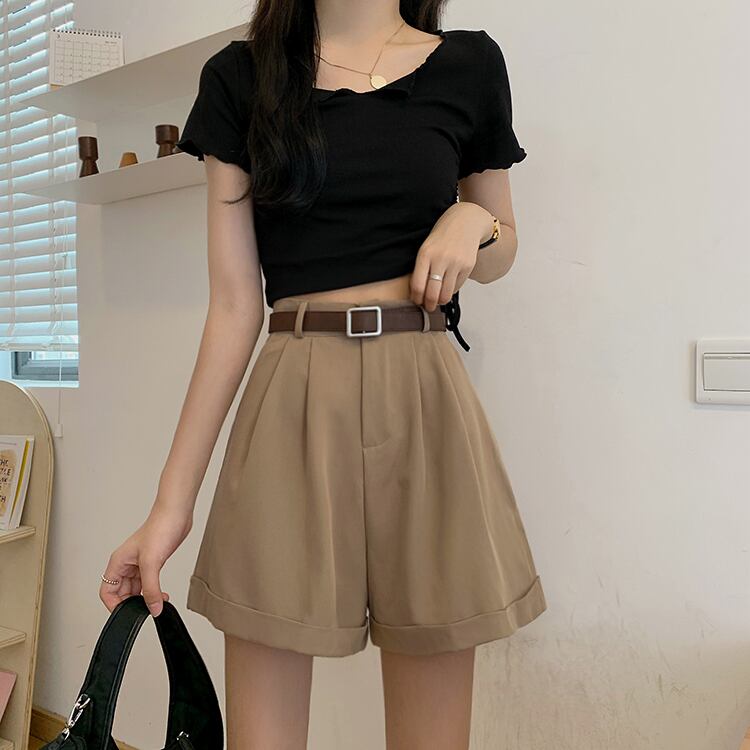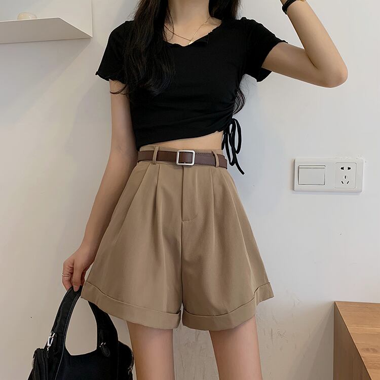 ショーツ レディースサマーブラックハイウェストウェストワイドレッグルーズカジュアルパンツ 夏物 ブルマー ワイドパンツ クレセントシティ85656130843
