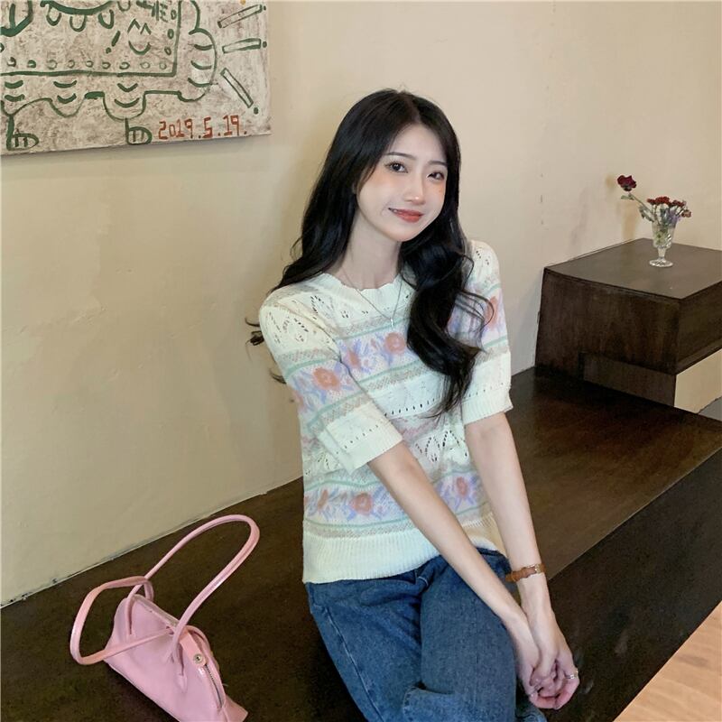 ジャカードサマールーズショートセーター トップス 大人ガーリー スウィート キュート カジュアル 夏物 クレセントシティ48169579731