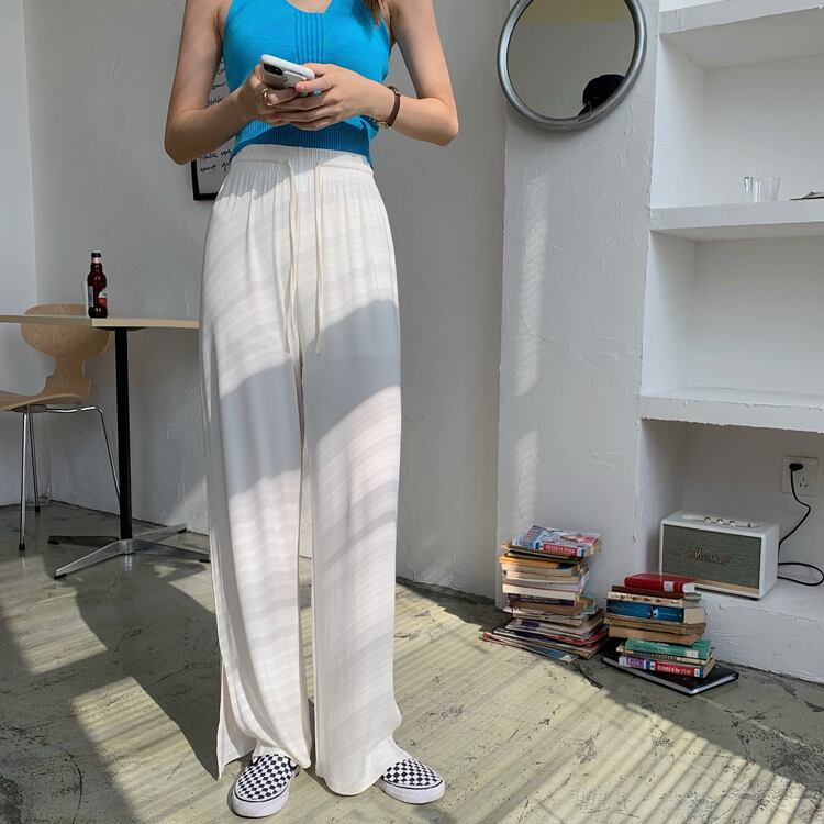 ホワイトカジュアルパンツ サマーストレッチウェストルーズ薄手ハイウェスト エラスティック 伸縮 夏物 クレセントシティ54769130123