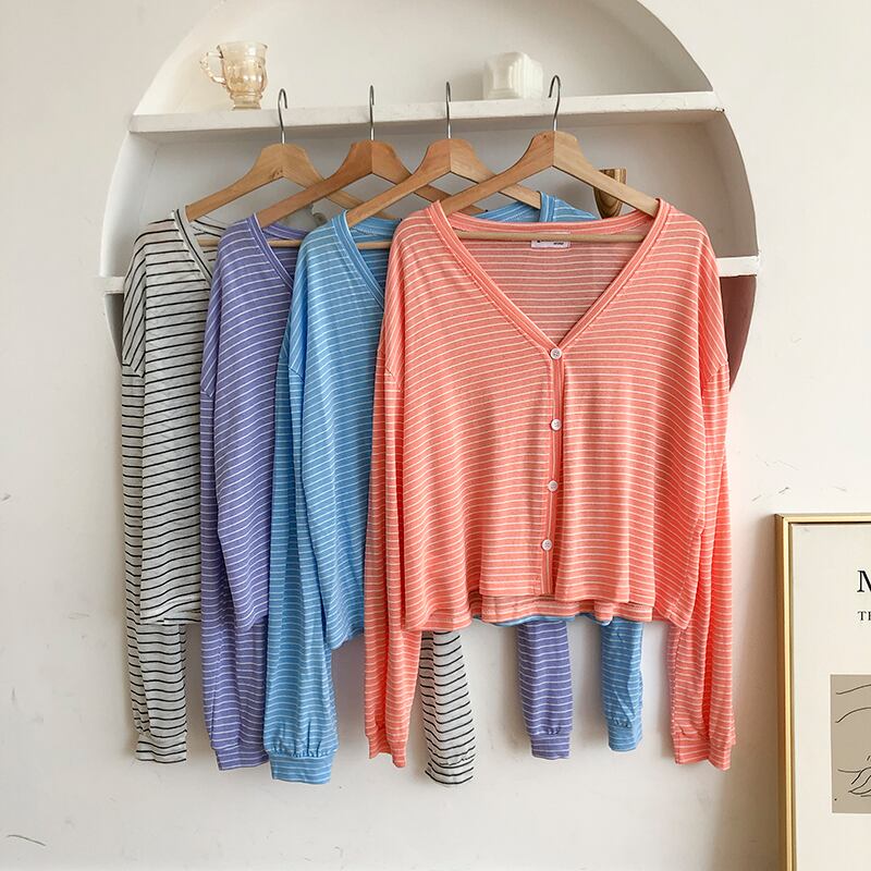 カラーストライプ長袖スリーブシャツ サマーカーディガンルーズ薄手トップス ロング 夏物 クレセントシティ47596793836