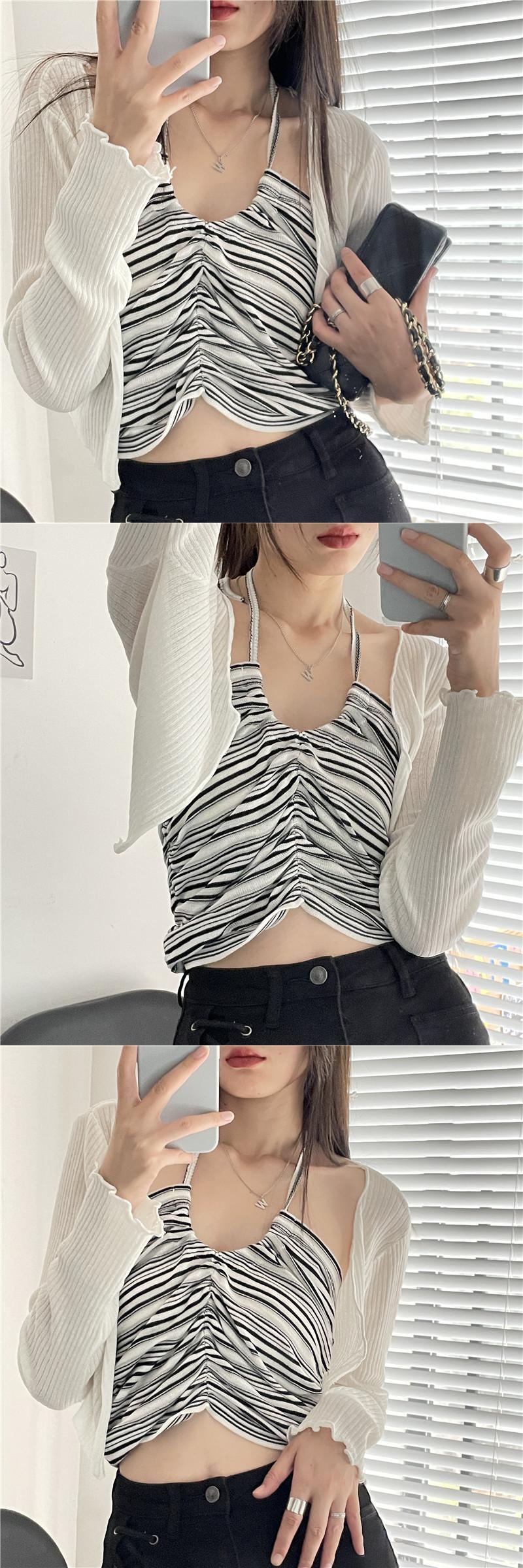 サマーストライプ薄手ニットカーディガンジャケット ロング 大人ガーリー スウィート キュート カジュアル 夏物 クレセントシティ38913208067
