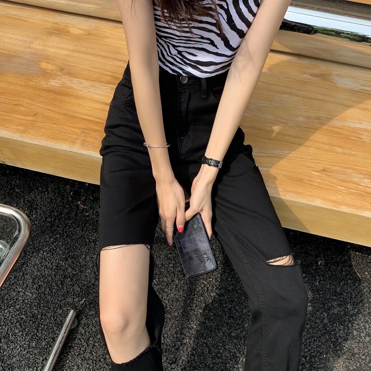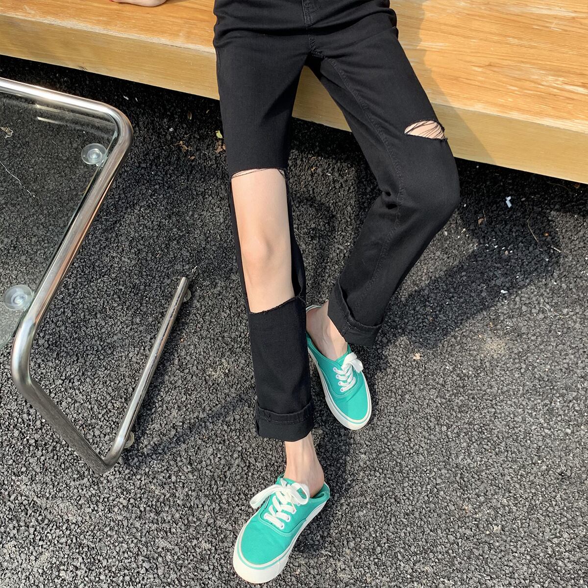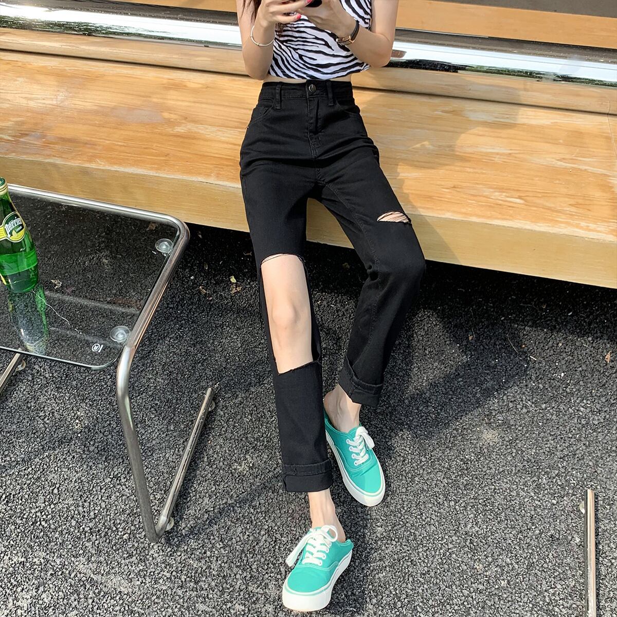 ブラックジーンズ サマー薄手ストレッチパンツ ハイウェスト エラスティック 伸縮 夏物 クレセントシティ65090006952