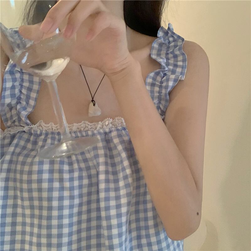 ブルー格子柄レースセット サマールーズ 大人ガーリー スウィート キュート カジュアル 夏物 クレセントシティ5877354060