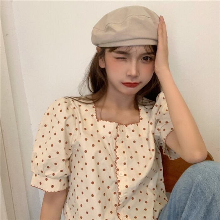 水玉シャツ サマースリーブルーズトップス 大人ガーリー スウィート キュート カジュアル 夏物 スクウェア クレセントシティ80745537564