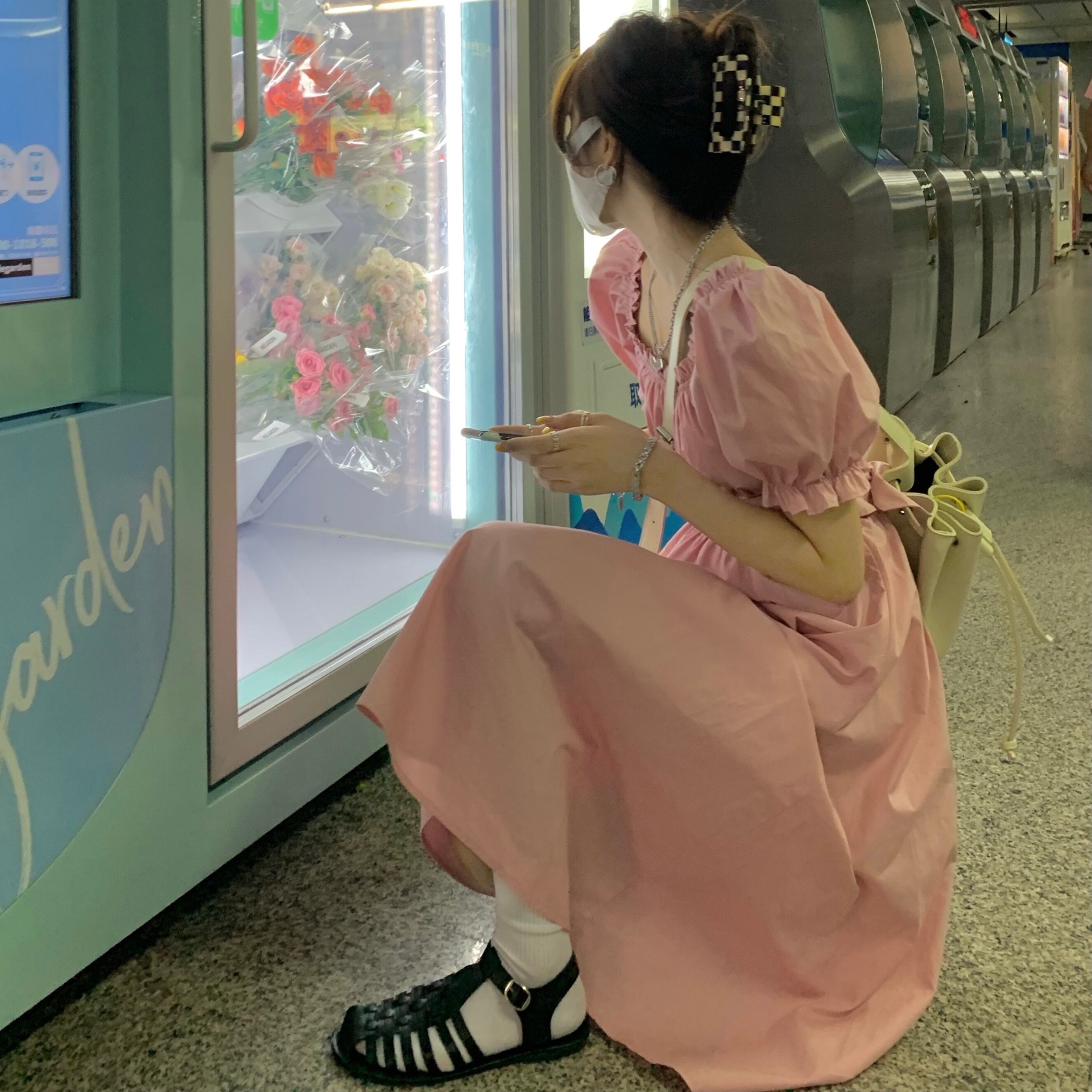 スリーブドレス サマーバックウェストAライン ピンク リボン 大人ガーリー スウィート キュート カジュアル 夏物 フラワーデザイン クレセントシティ6829400147