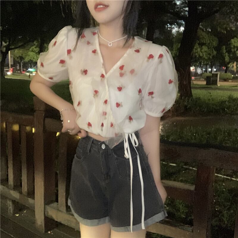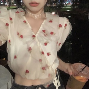 サマーメッシュFlowerデザイン Vネックシャツ ショートスリーブ 大人ガーリー スウィート キュート カジュアル 夏物 フラワーデザイン クレセントシティ72581505895
