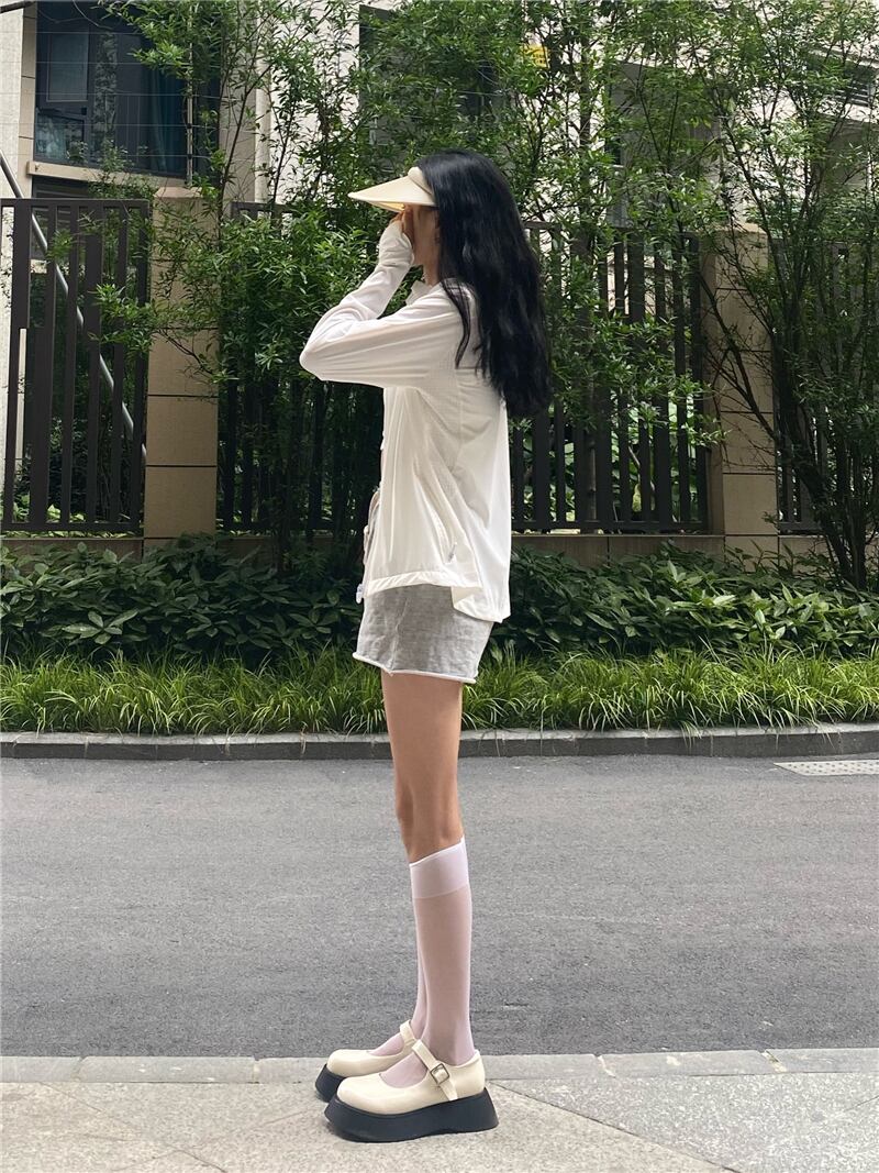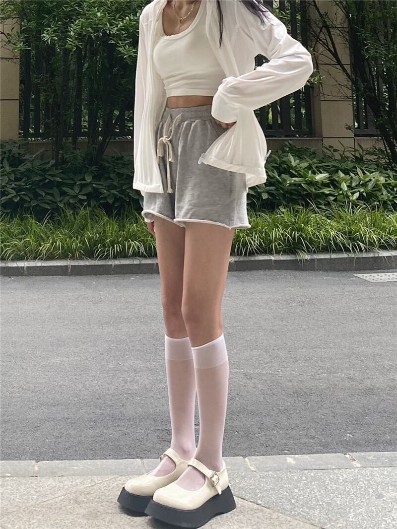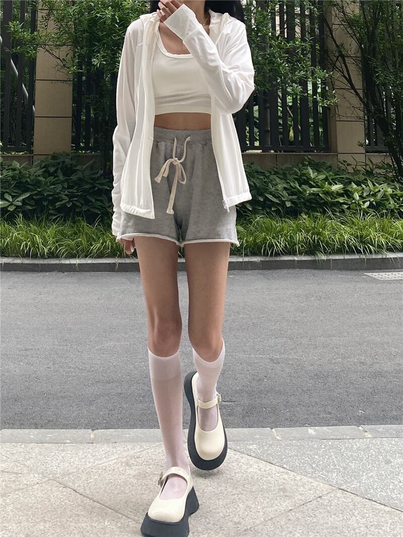 色:ホワイトサスペンダー,白い日焼け止め,グレーのショートパンツ