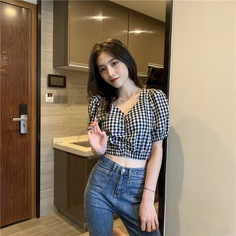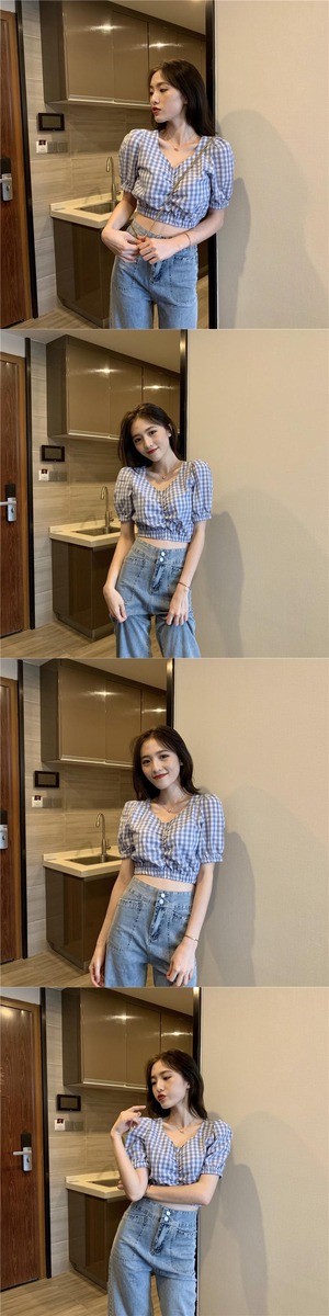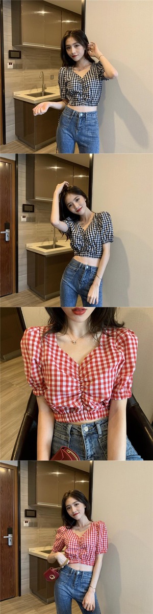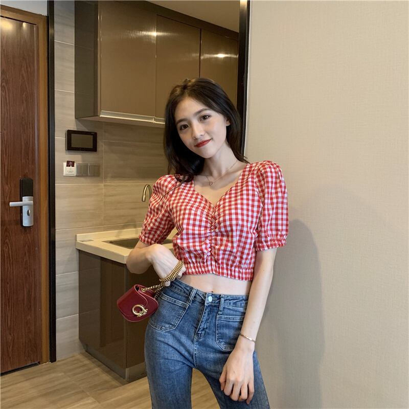 サマースリーブ格子柄トップス Vネックスタイルショートシャツ 夏物 クレセントシティ12750963012