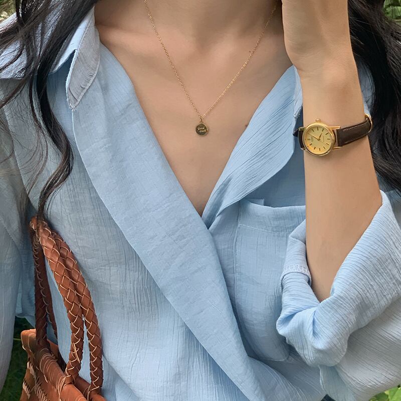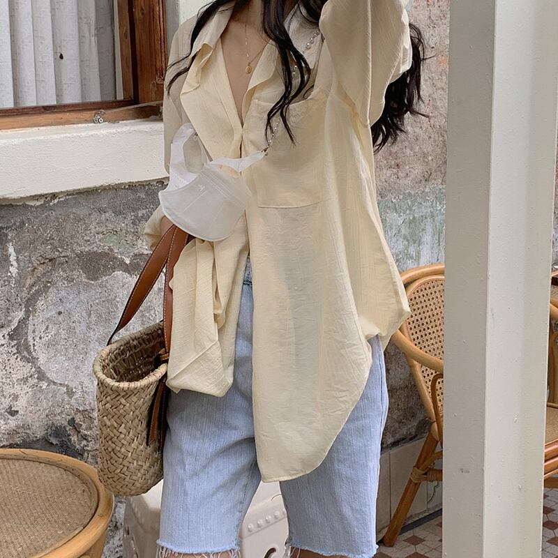 スタンダードブルーシャツ サマーカジュアルルーズ薄手 ロング レトロ 夏物 クレセントシティ24789494201