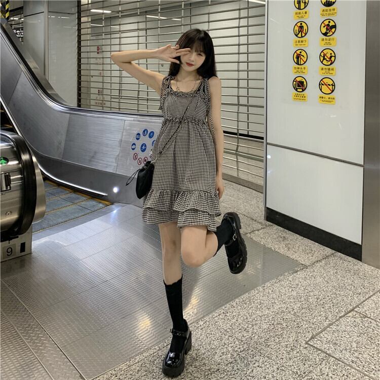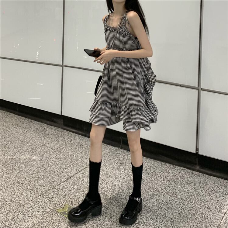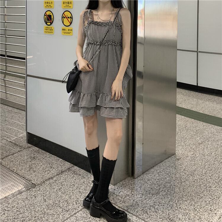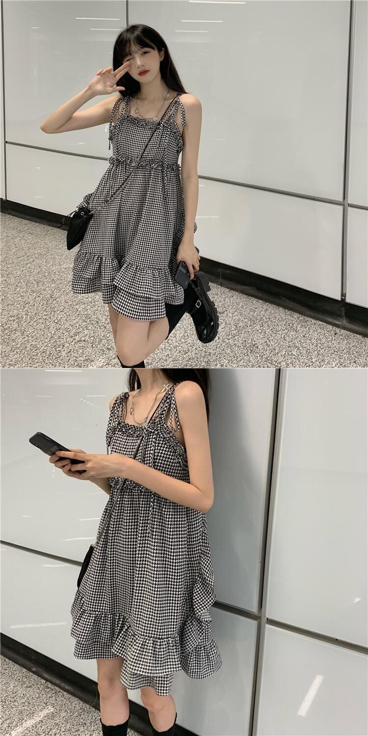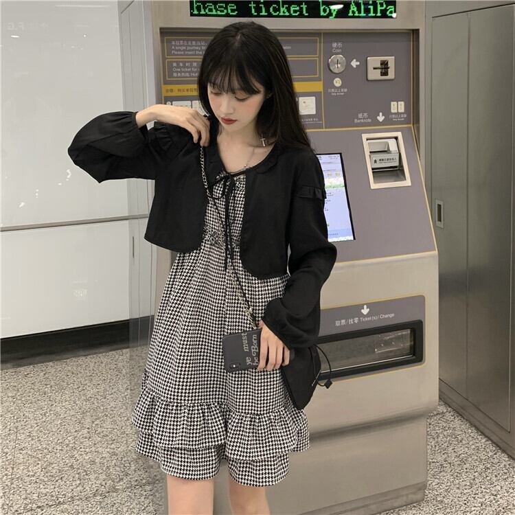色:ブラックカーディガン,千鳥格子サスペンダースカート