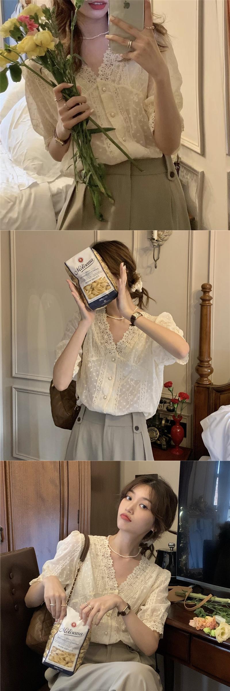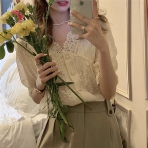 レースシャツ サマースタイルVネックルーズカラー 夏物 ピュア クレセントシティ494410356