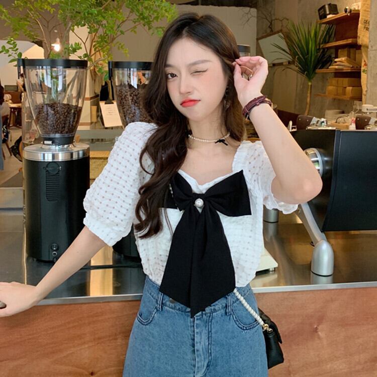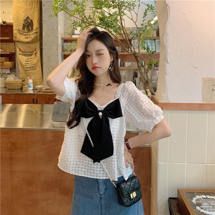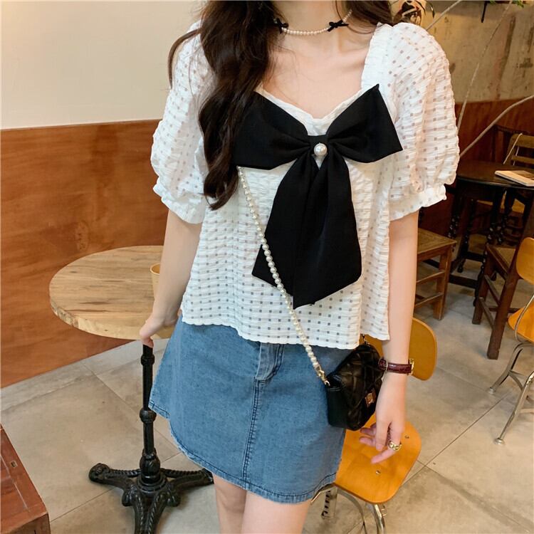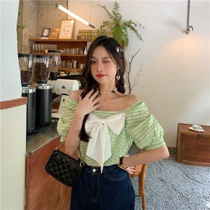 サマースタイルスリーブトップス リボンカラールーズ薄手格子柄シャツ レディース 夏物 スクウェア クレセントシティ65503599215