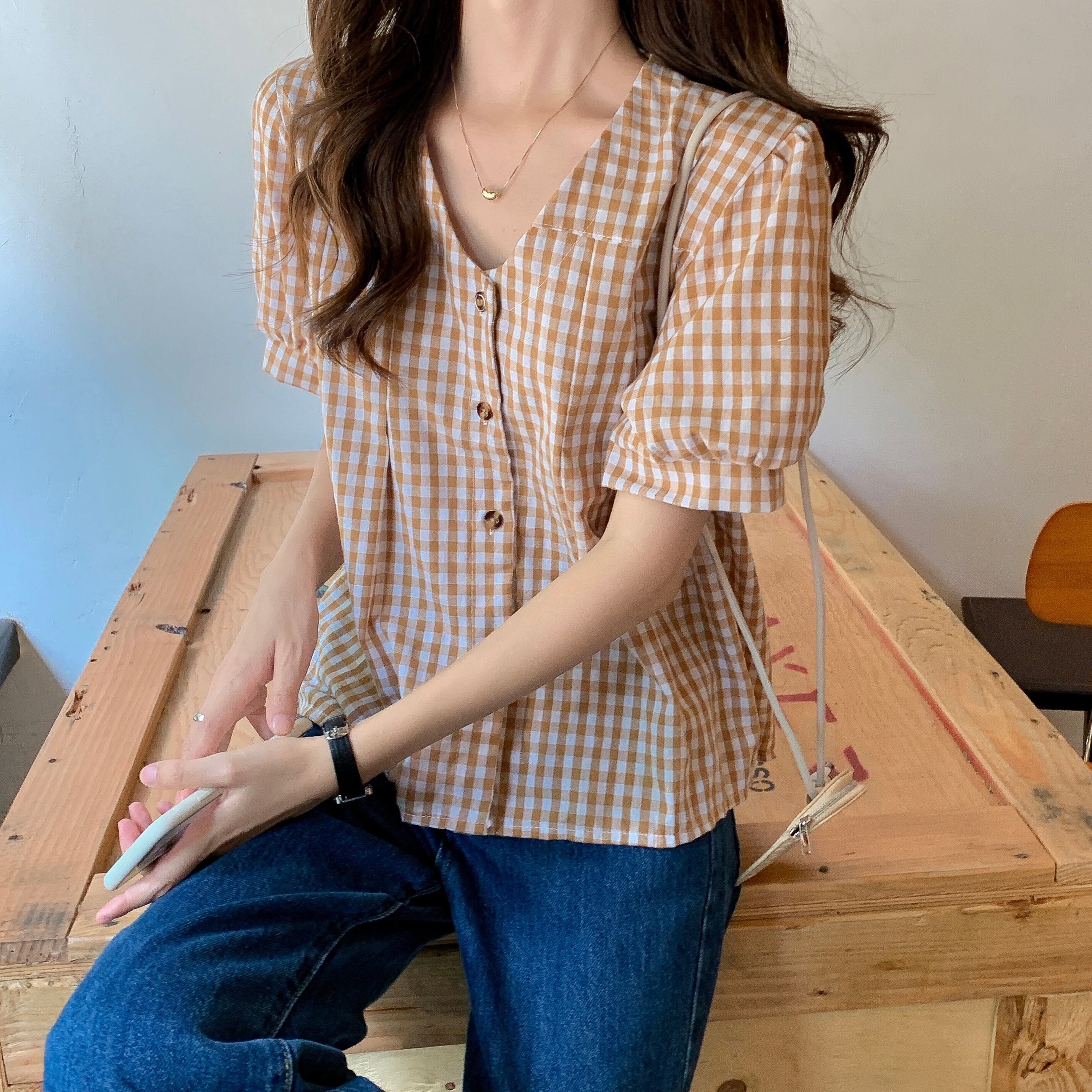 スリーブ格子柄シャツ サマーVネックルーズ薄手トップス 大人ガーリー スウィート キュート カジュアル 夏物 クレセントシティ33600080606