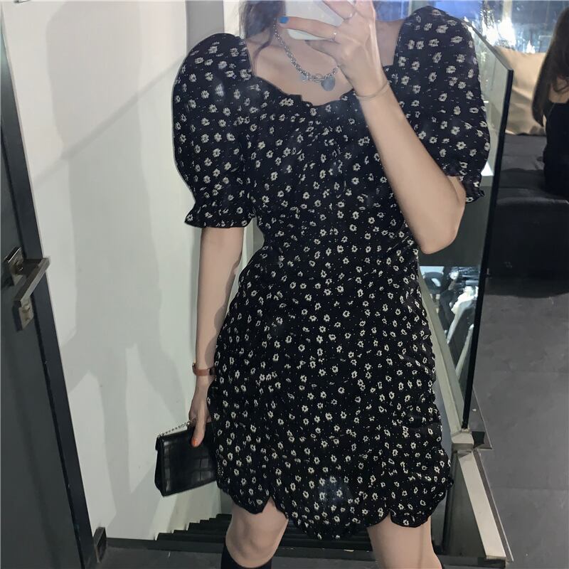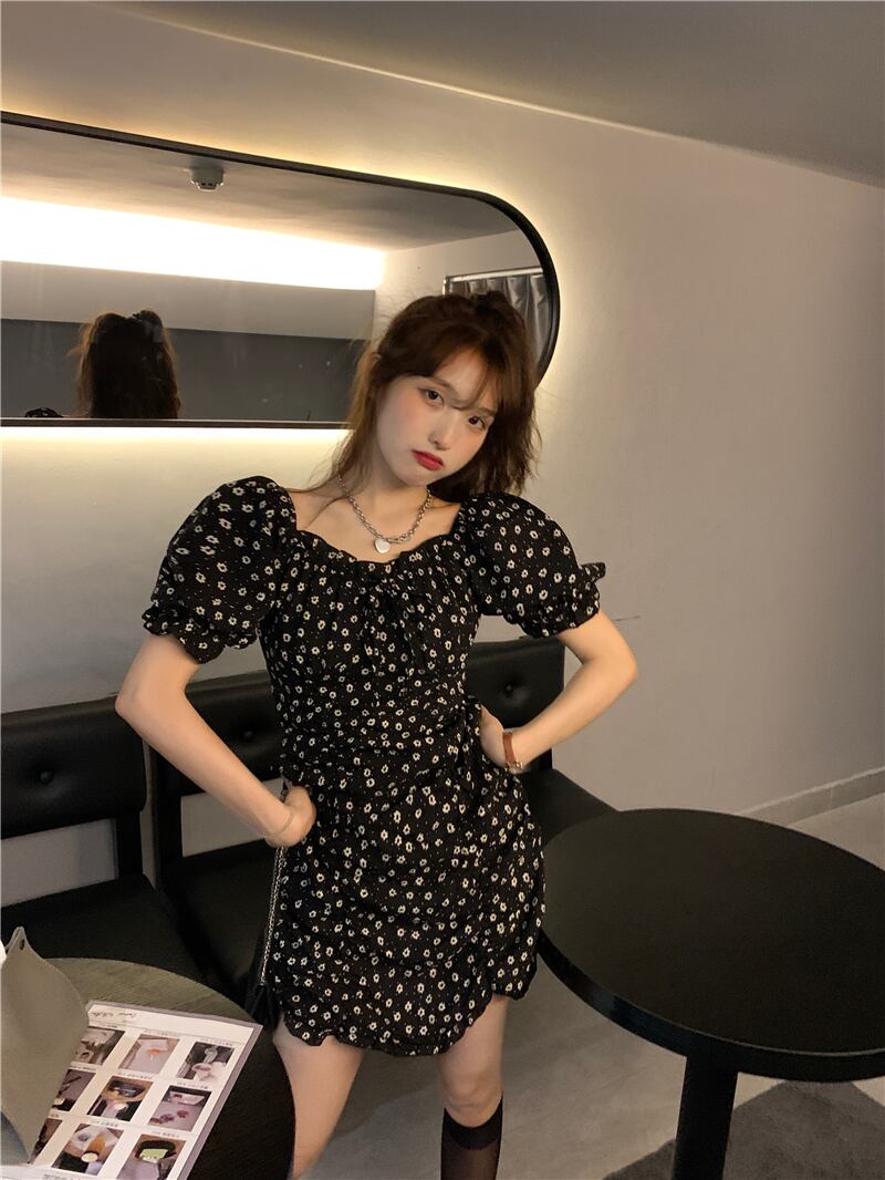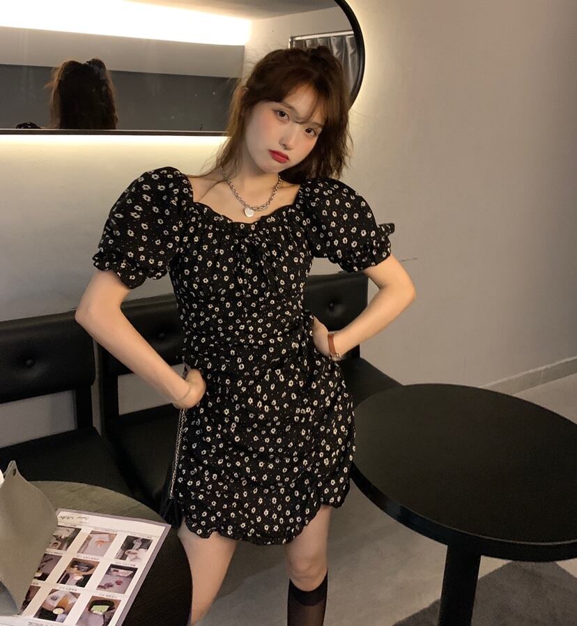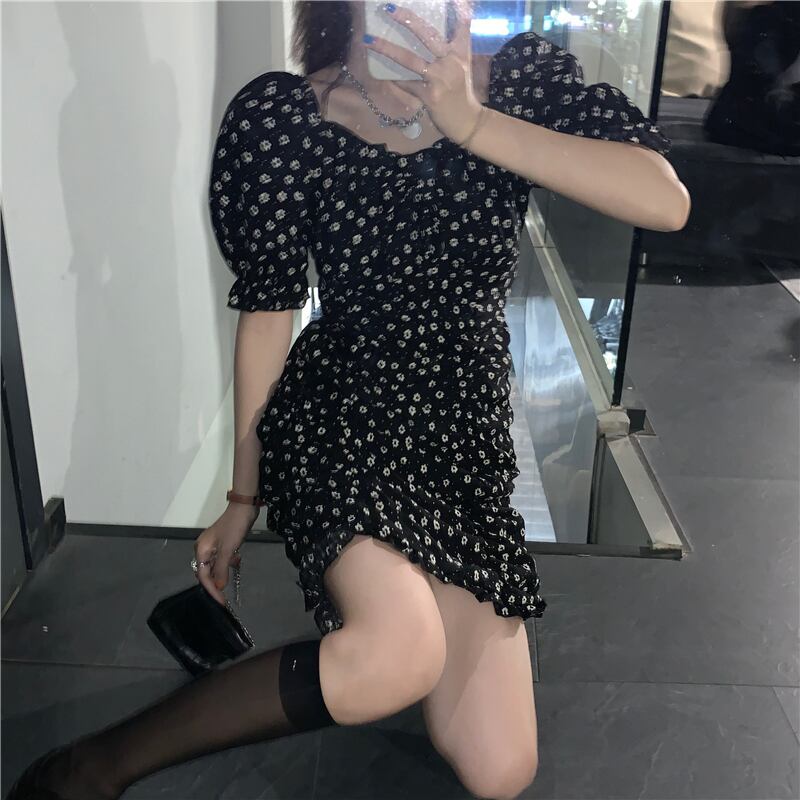 カラードレス サマースリーブブラックプリーツウェストスカート Aラインフローラル 大人ガーリー スウィート キュート カジュアル 夏物 花柄 スクウェア クレセントシティ21848546659