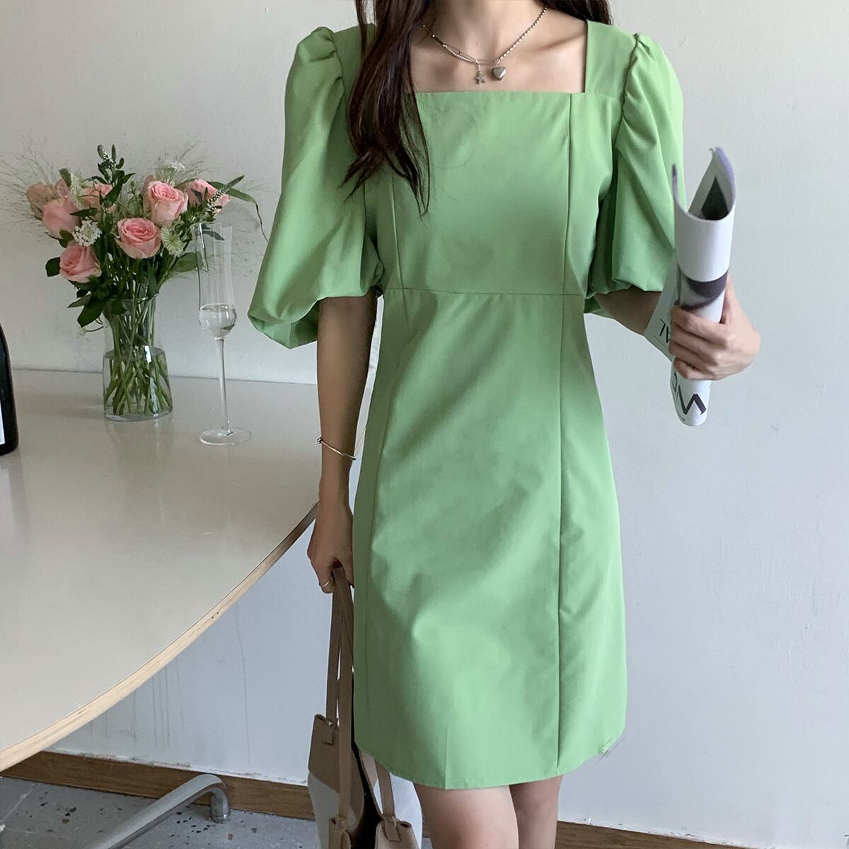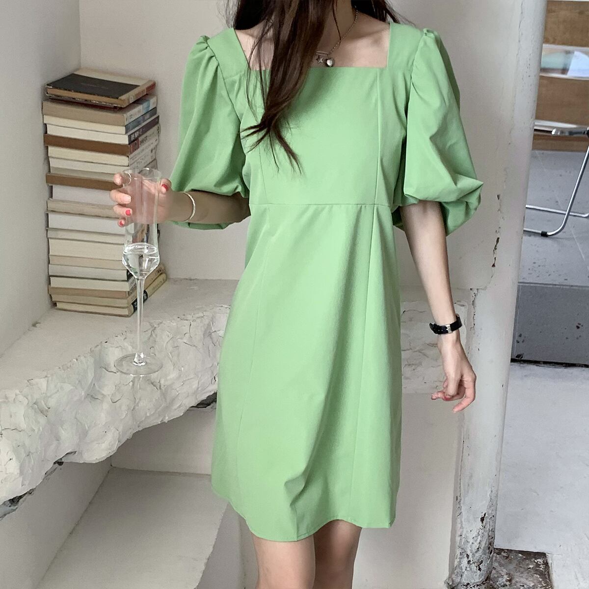 ドレス サマースリーブスタンダードカラーウェストAラインショートスカート レトロ 夏物 ピュア スクウェア クレセントシティ61390509690