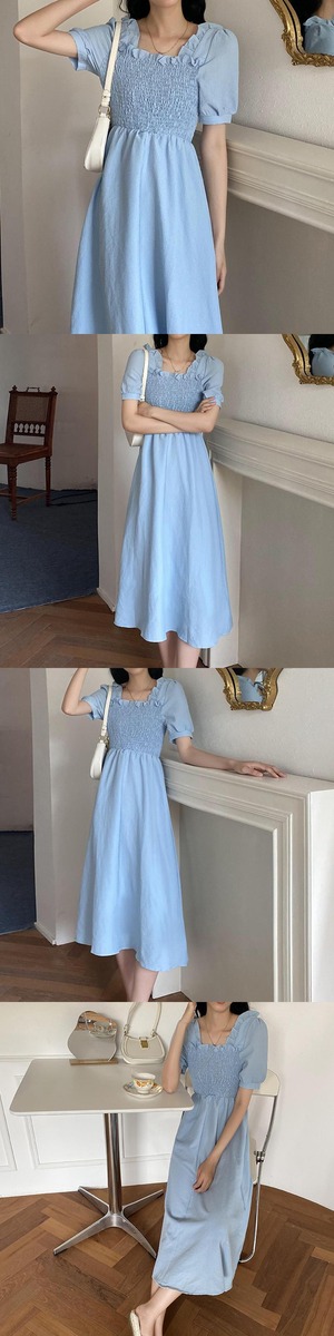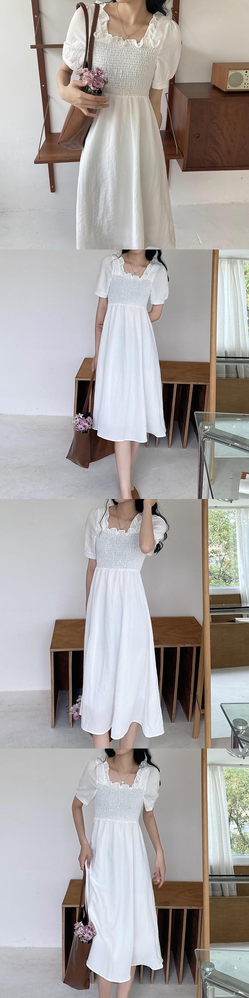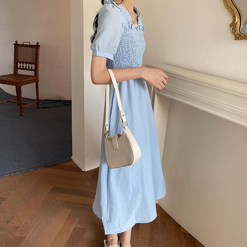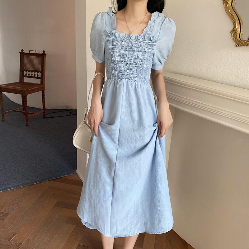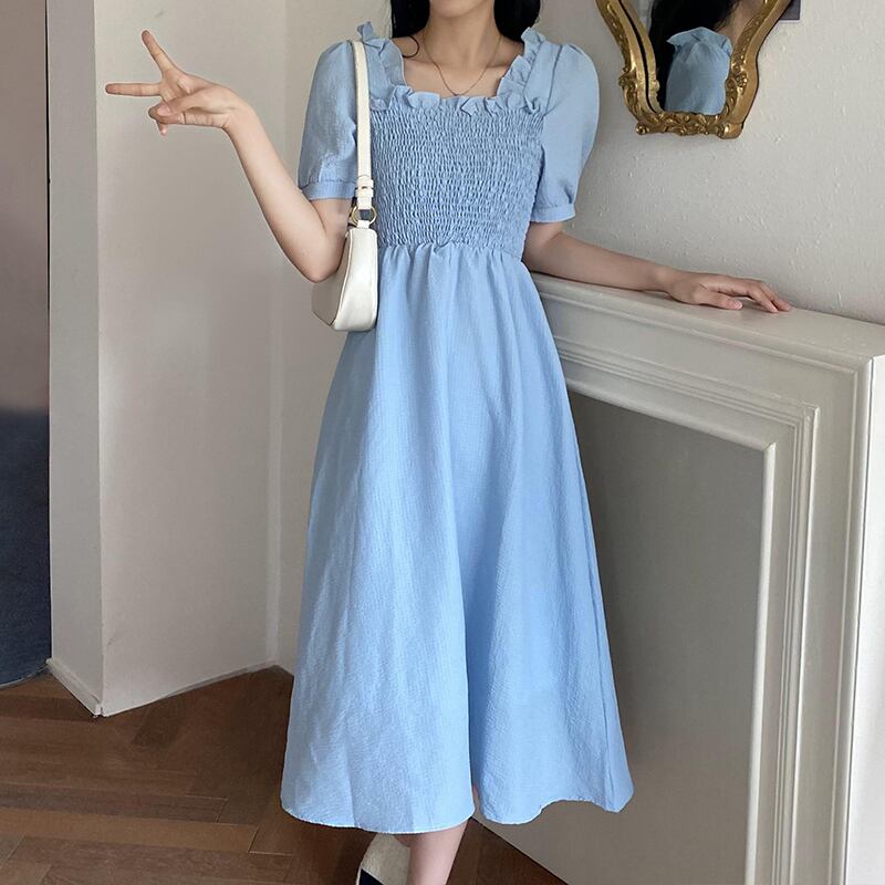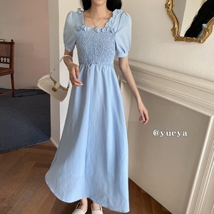 カラーレーススリーブドレス サマーハイウェストウェストAラインスカート 夏物 スクウェア クレセントシティ38232247062