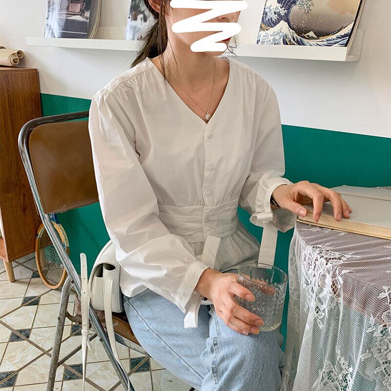 ホワイトシャツ サマースタンダードVネックウェスト薄手 ロング レトロ 夏物 クレセントシティ85854340833