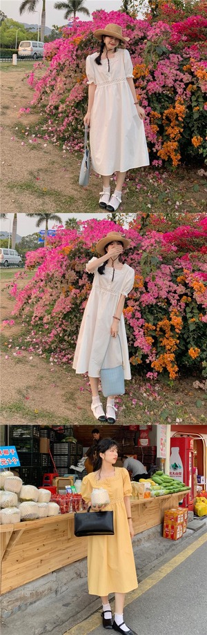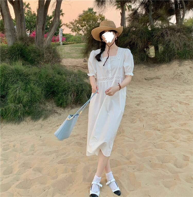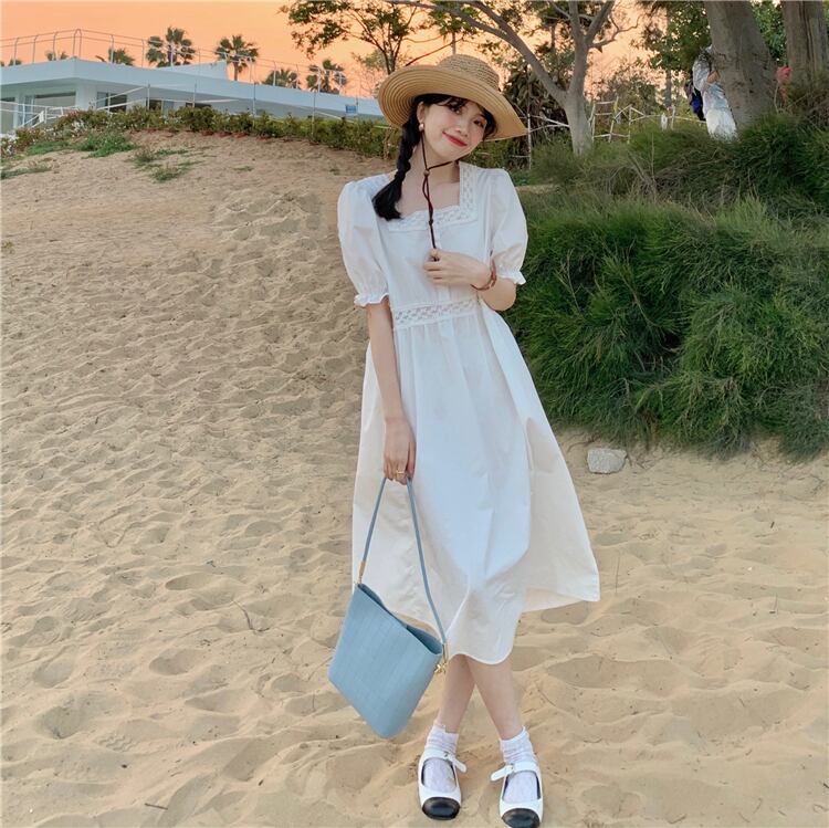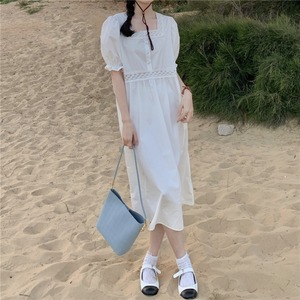 スタンダードカラードレス サマースリーブウェストホワイトAライン レトロ 大人ガーリー スウィート キュート カジュアル 夏物 スクウェア クレセントシティ49452187757