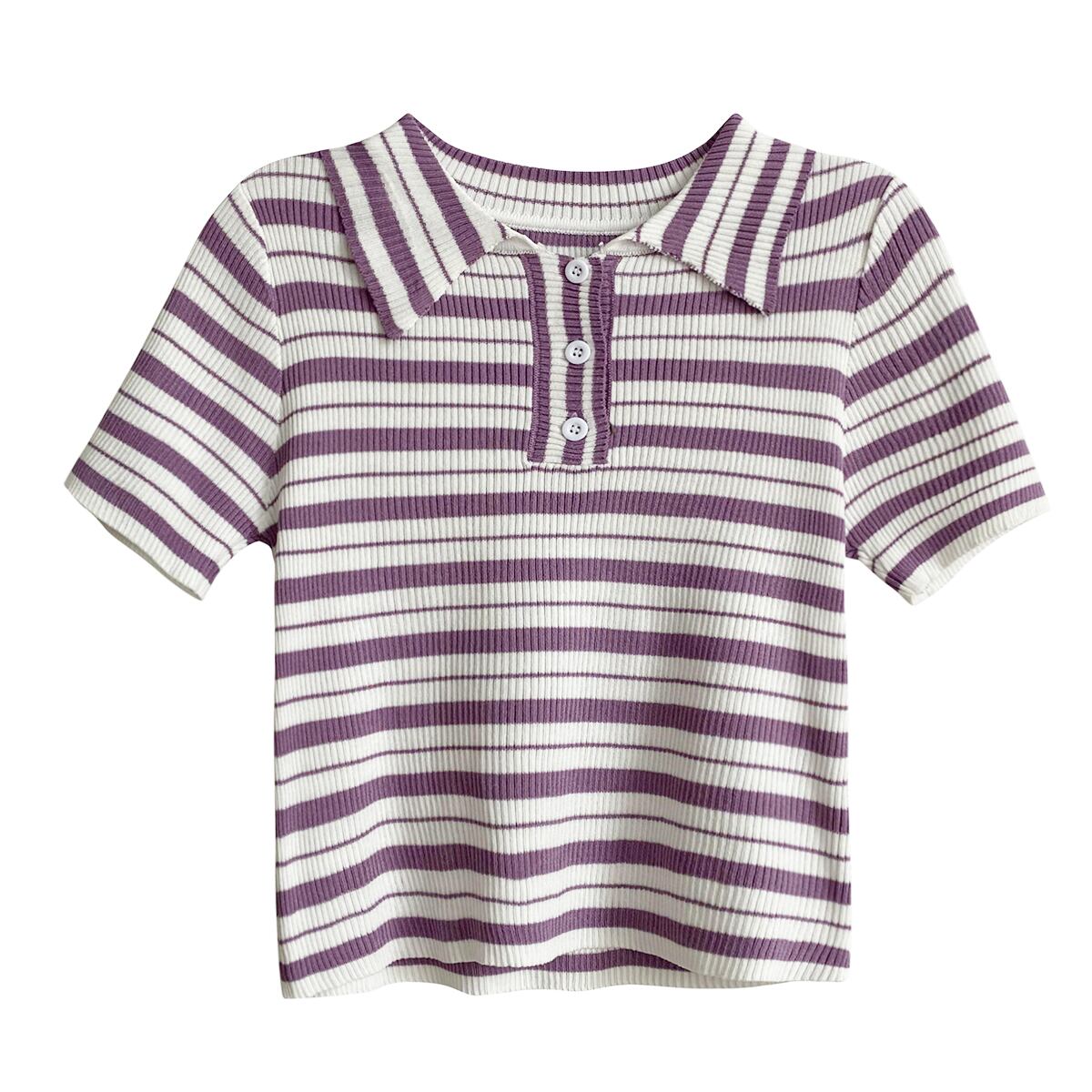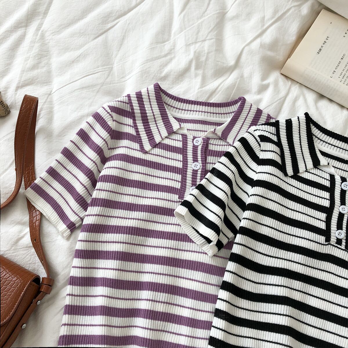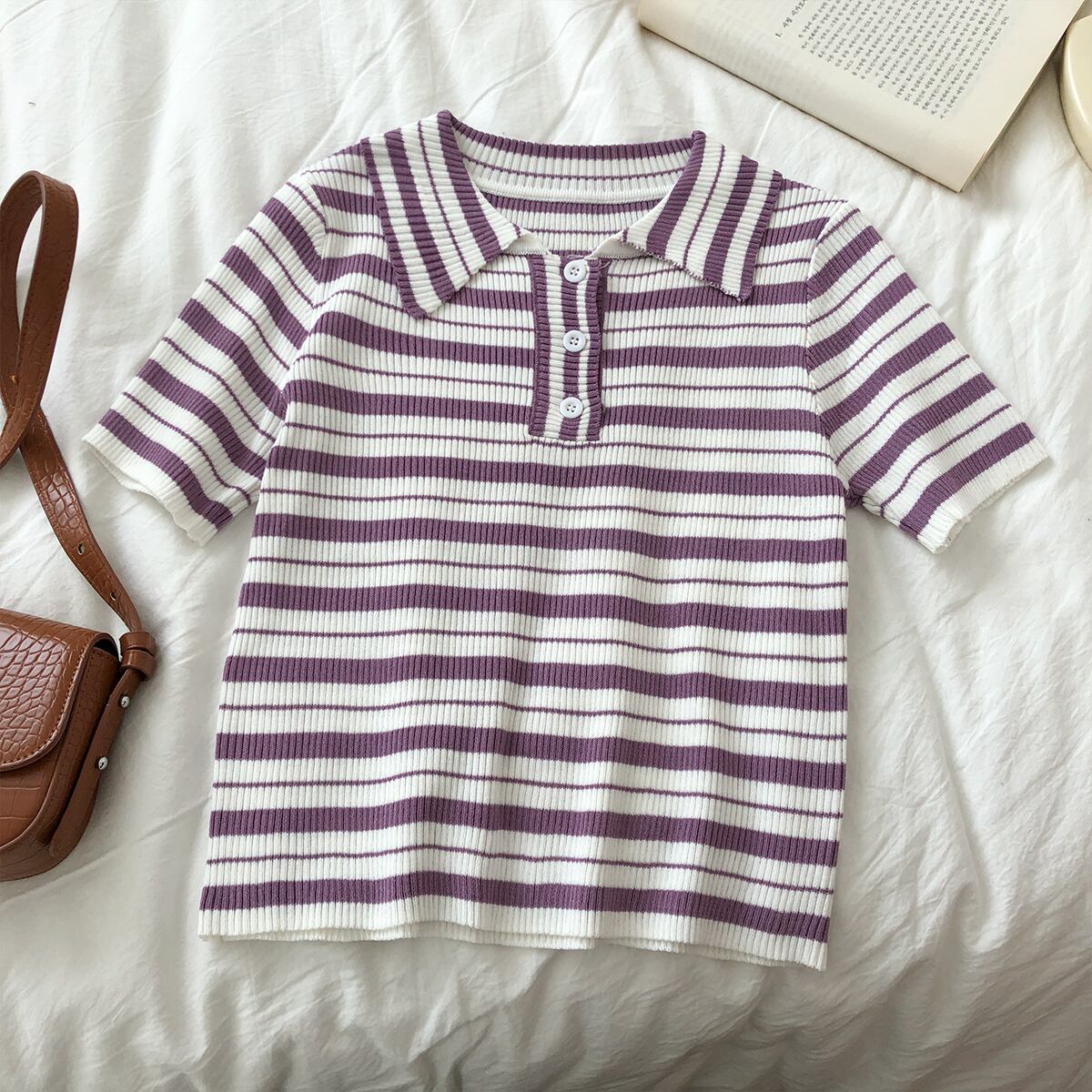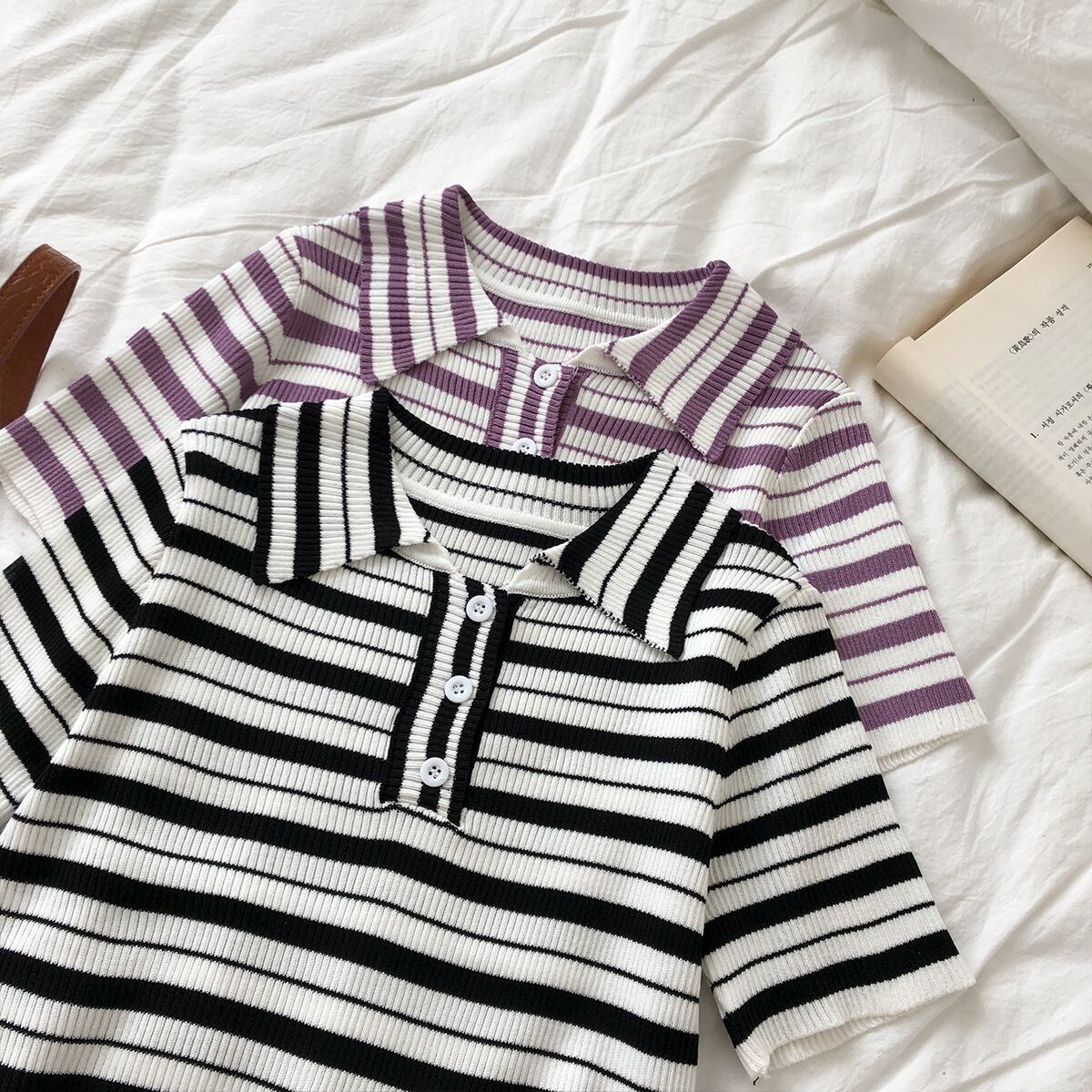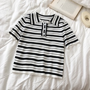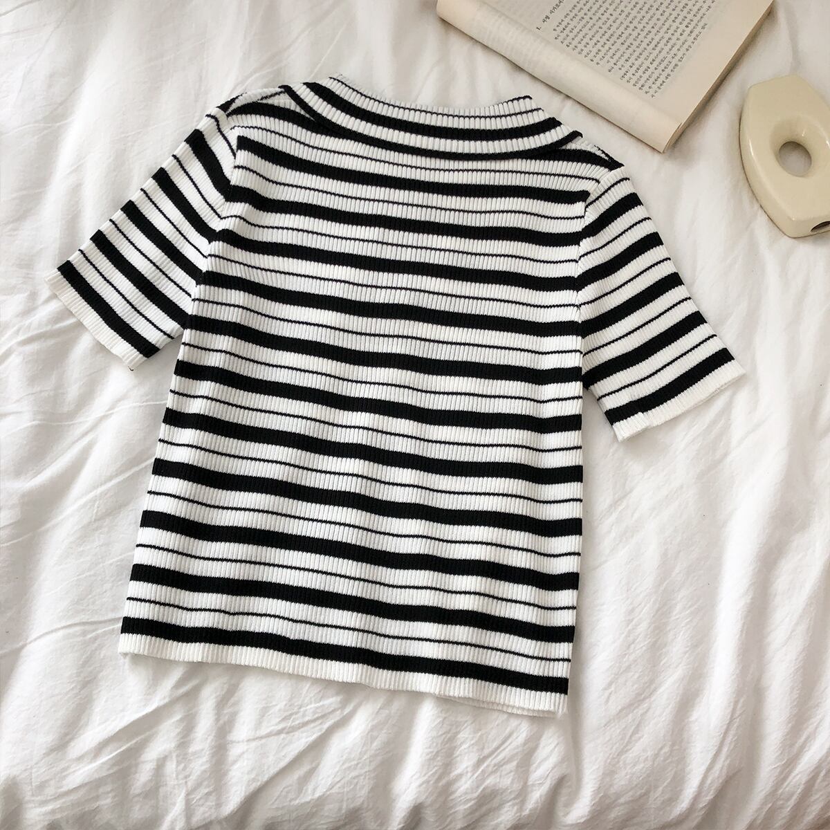 スタンダードスリム半袖スリーブセーター レディースサマーストライプ薄手トップス ショート レトロ ハーフスリーブ 夏物 クレセントシティ77596108778