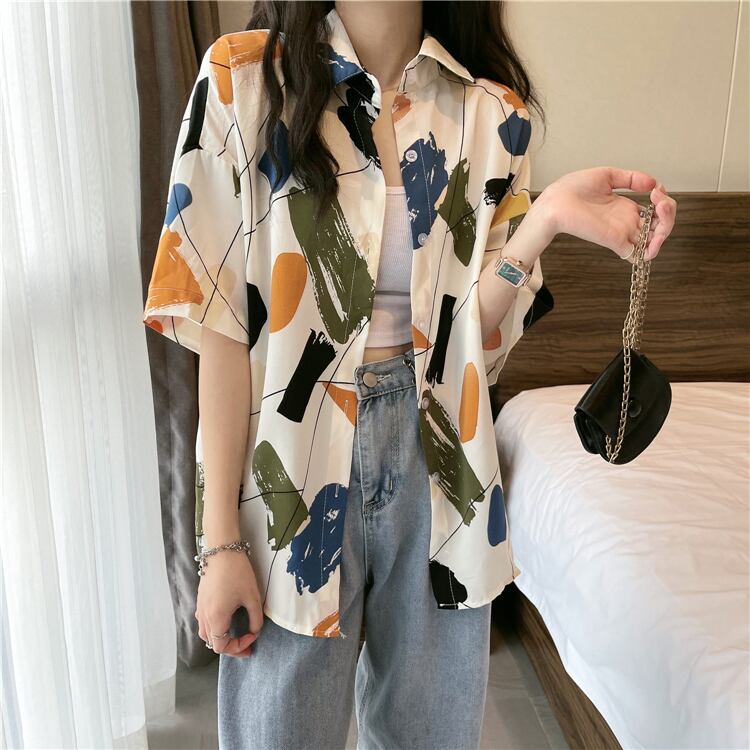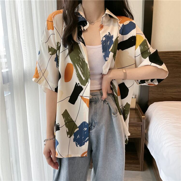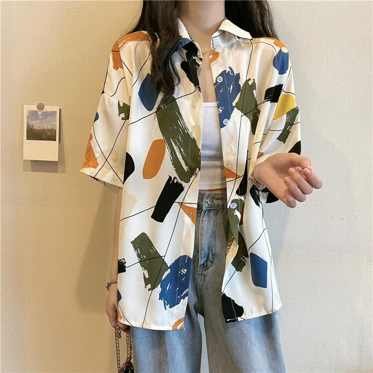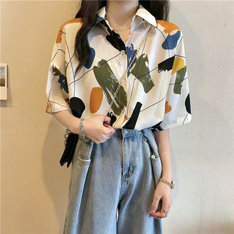 プリントシフォンシャツ サマースタンダードルーズ薄手 レトロ 夏物 クレセントシティ78029517167