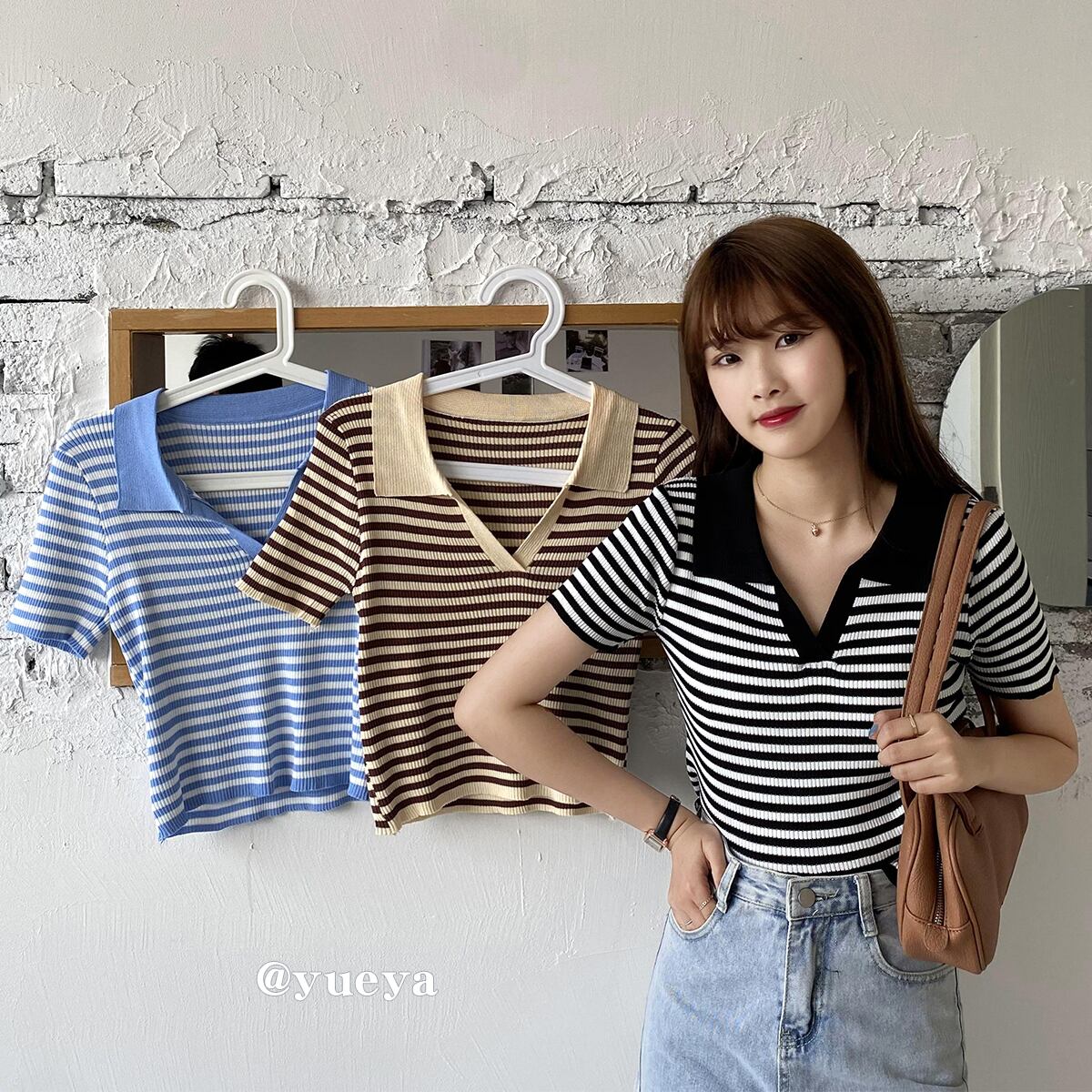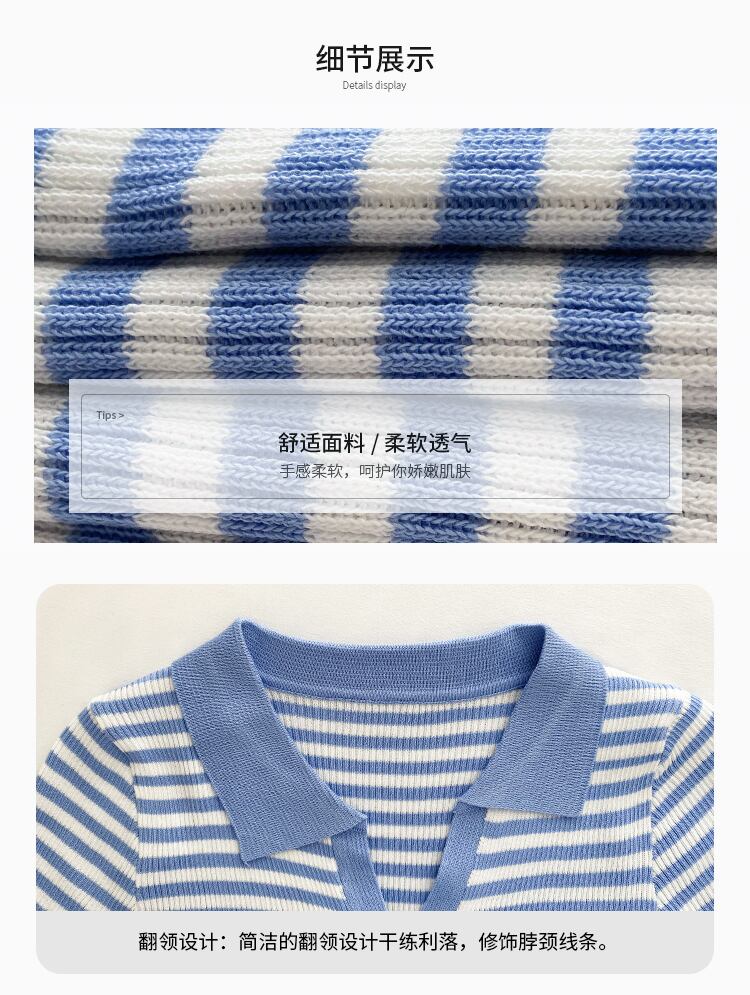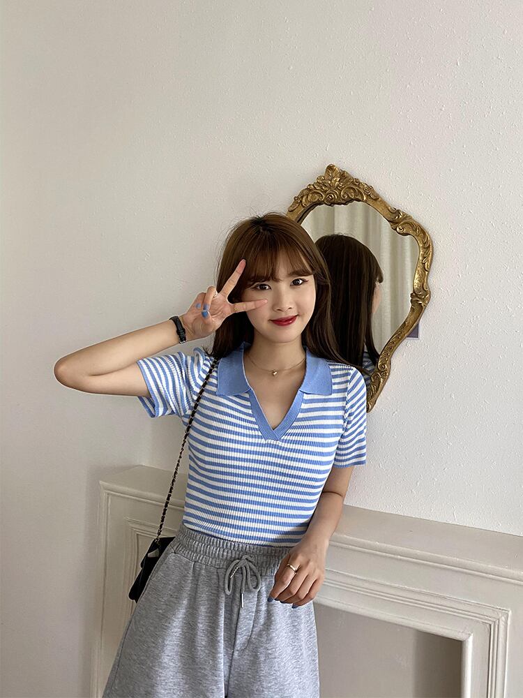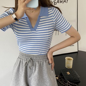 ストライプ半袖スリーブTシャツ シャツ サマースリム薄手ニットトップス ショート ハーフスリーブ 夏物 クレセントシティ55692207820
